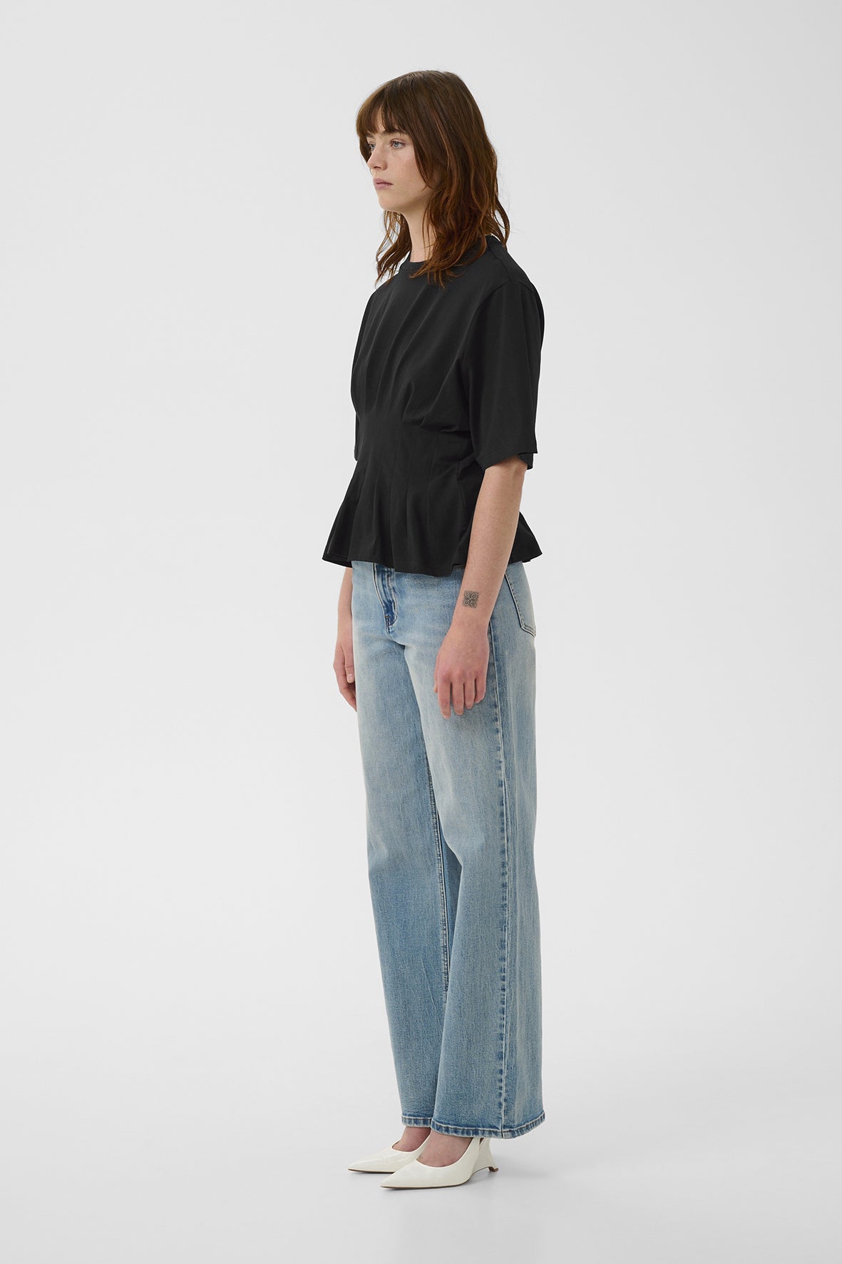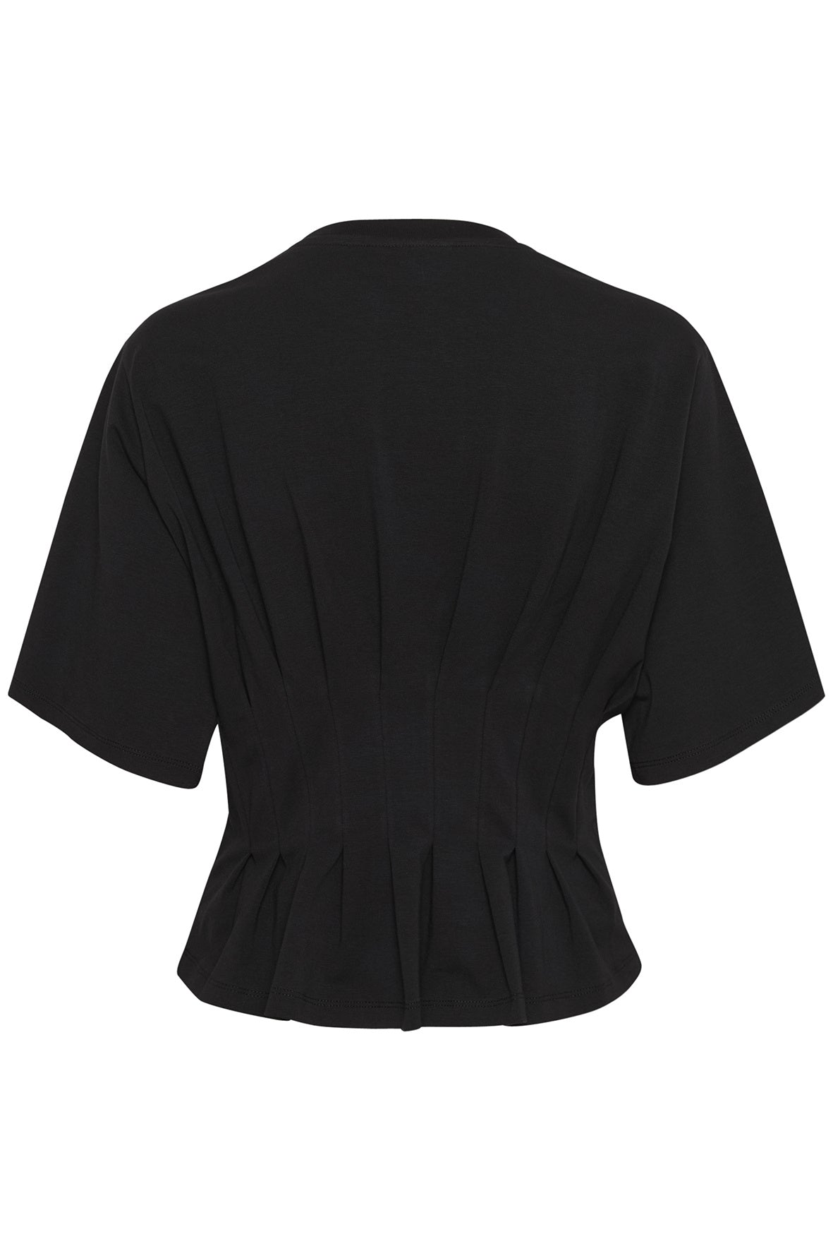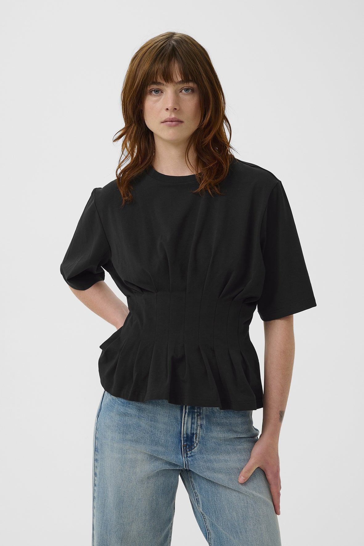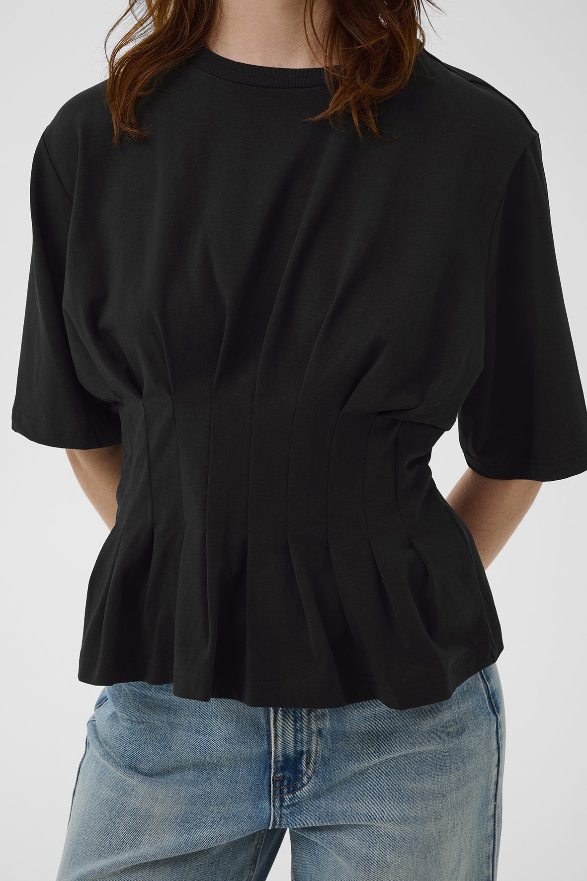 Nauwsluitend T-shirt met structuurnaden en wijde, korte mouwen. Voorzien van ronde hals en geplooide zoom voor een gevormde look die de taille accentueert – een verfijnde twist op een casual klassieker. Het model is 180 cm lang en draagt maat S/36.