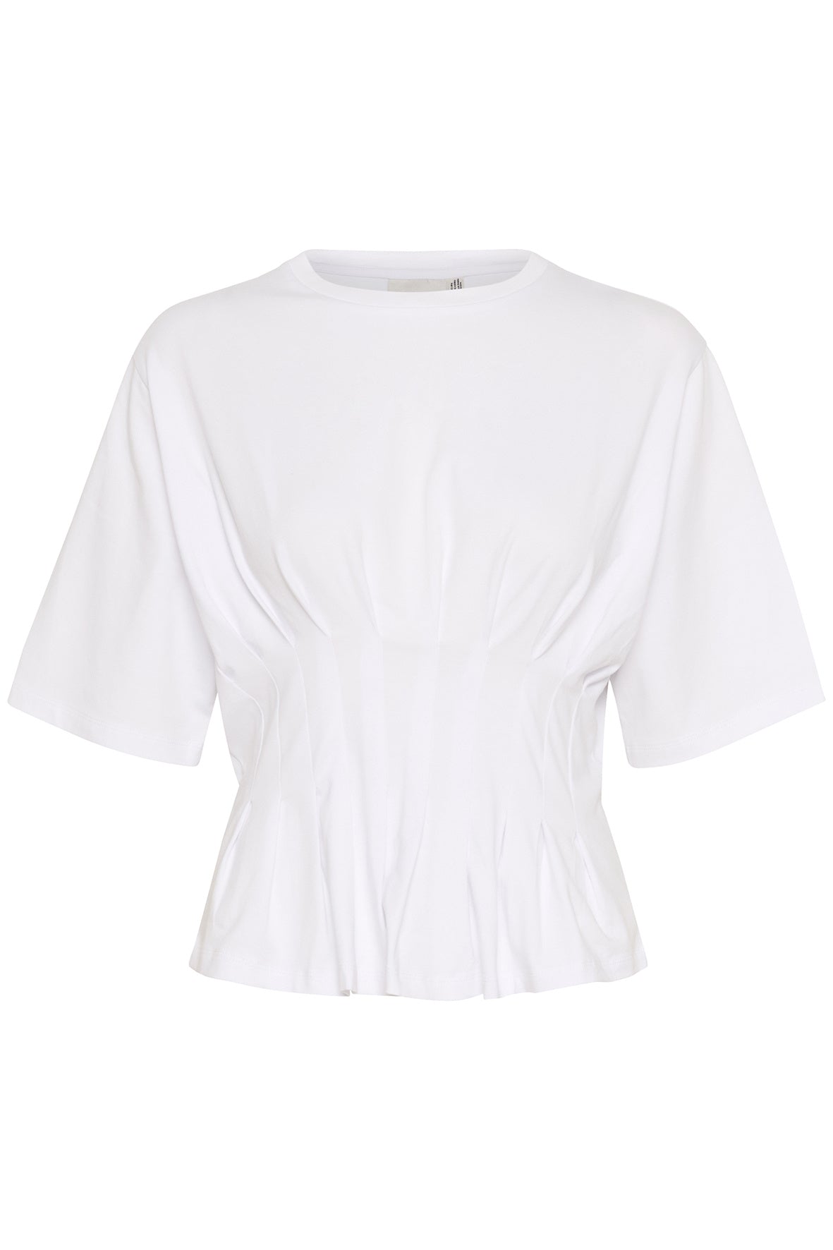 Nauwsluitend T-shirt met structuurnaden en wijde, korte mouwen. Voorzien van ronde hals en geplooide zoom voor een gevormde look die de taille accentueert – een verfijnde twist op een casual klassieker. Het model is 179 cm lang en draagt maat S/36.