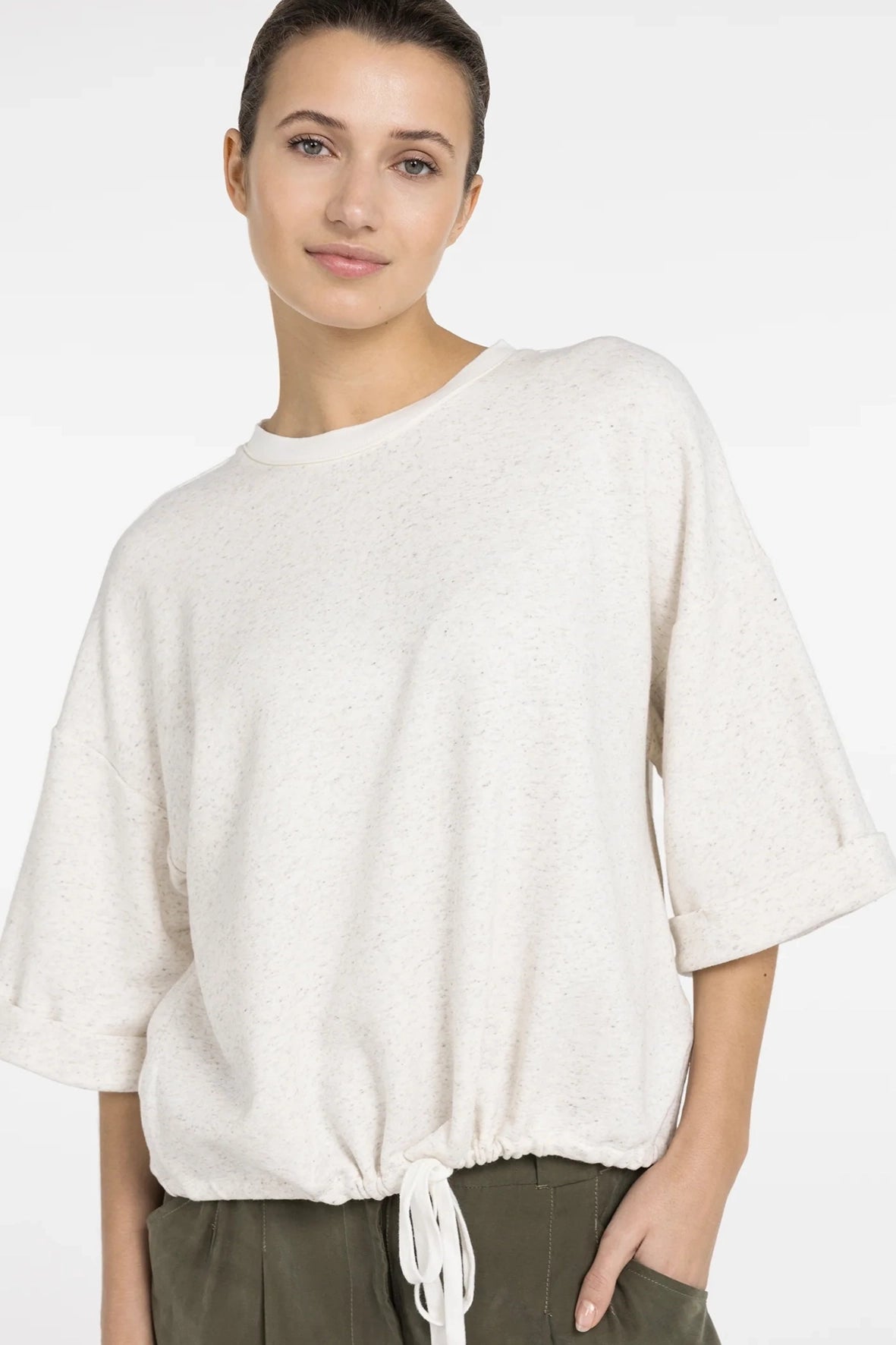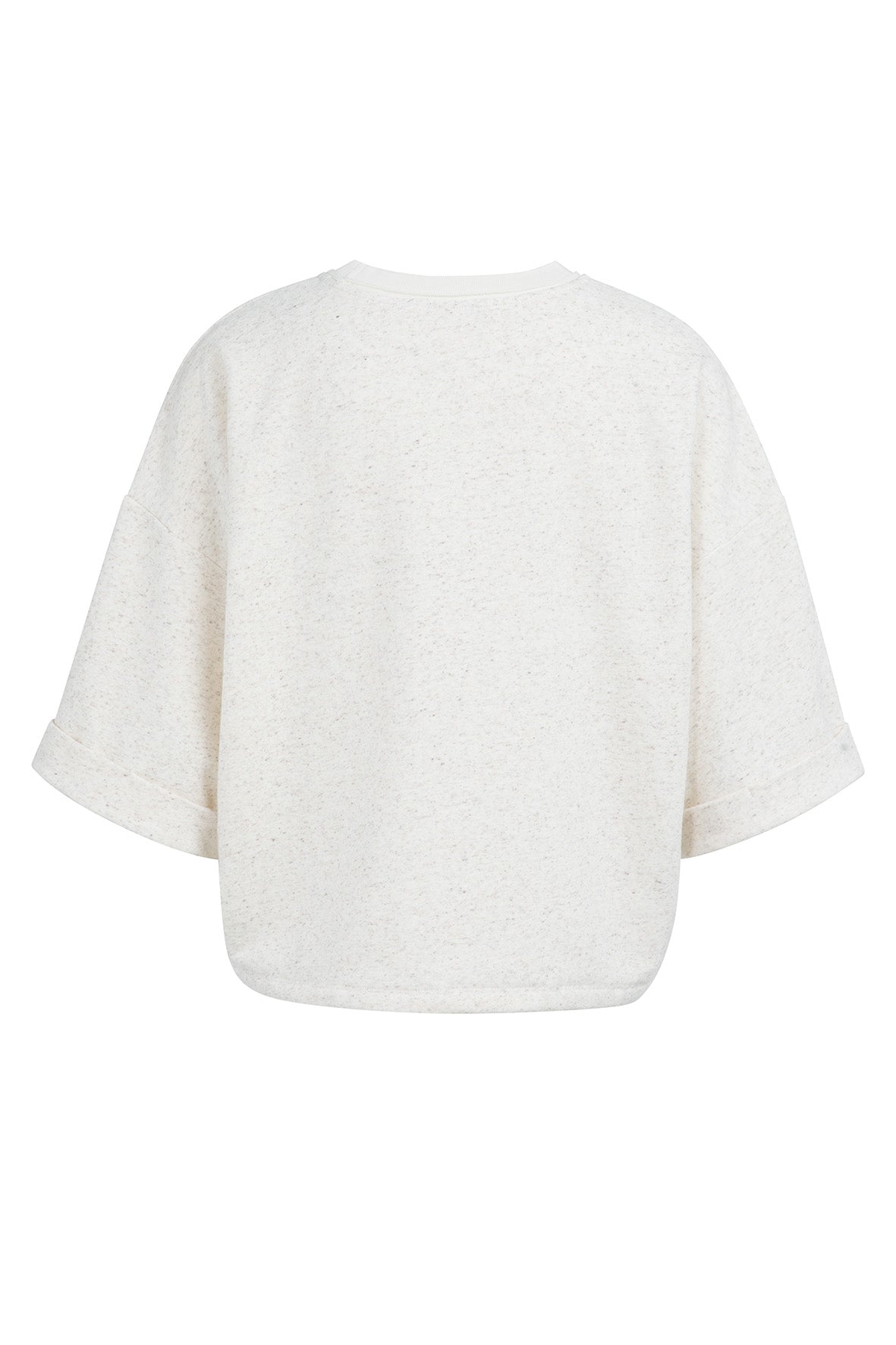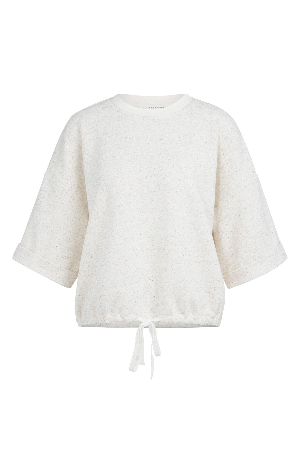 Deze losse sweatshirt top is gemaakt van een zachte, licht gemêleerde sweatstof. Het model heeft korte, wijde mouwen met een vaste omslag, een ronde hals en een verstelbaar strikkoord in de zoom. De ontspannen pasvorm maakt het een ideaal item voor een casual, comfortabele look. Mooi te combineren met een jeans of short.