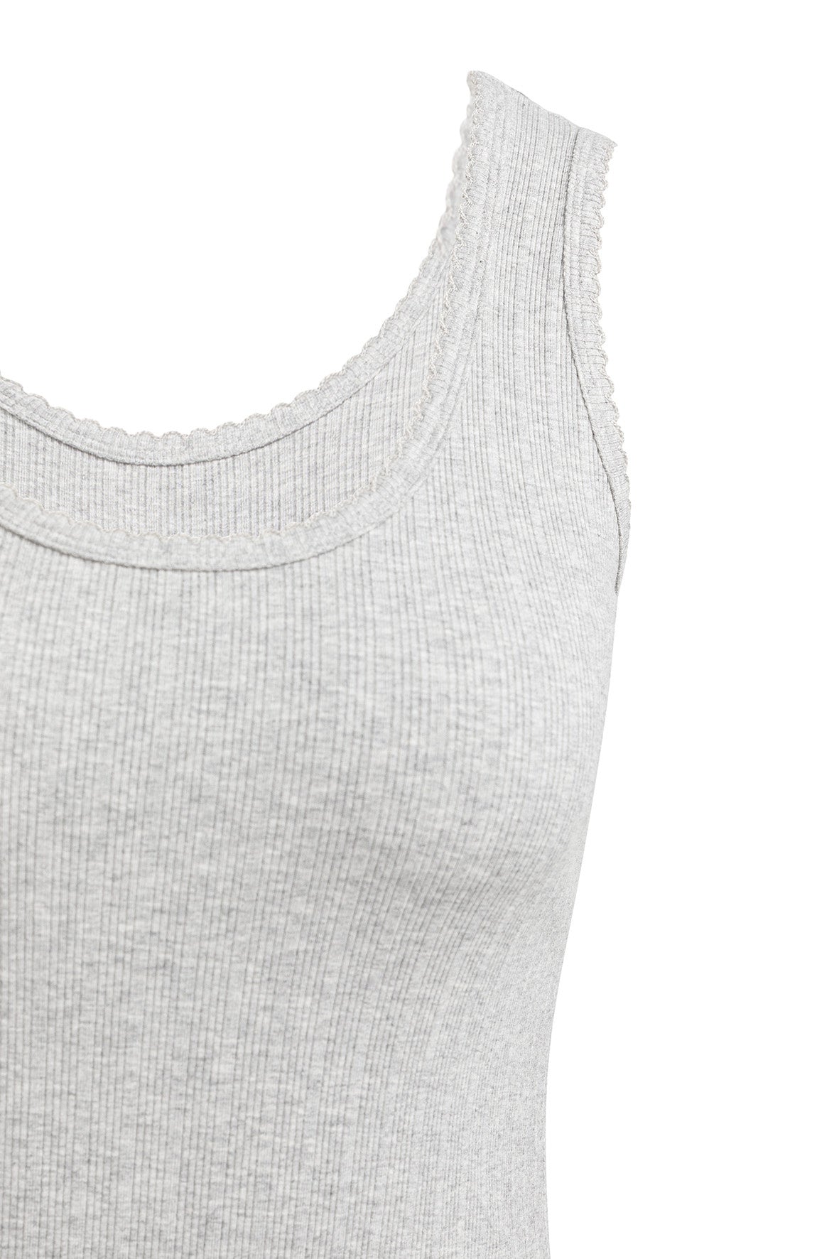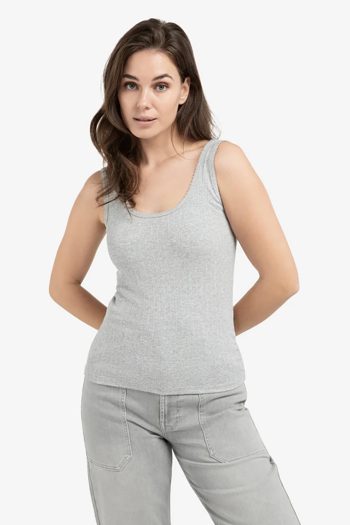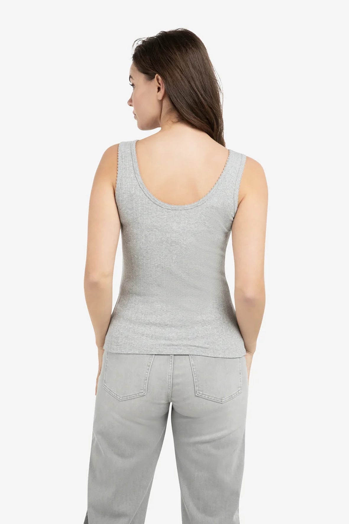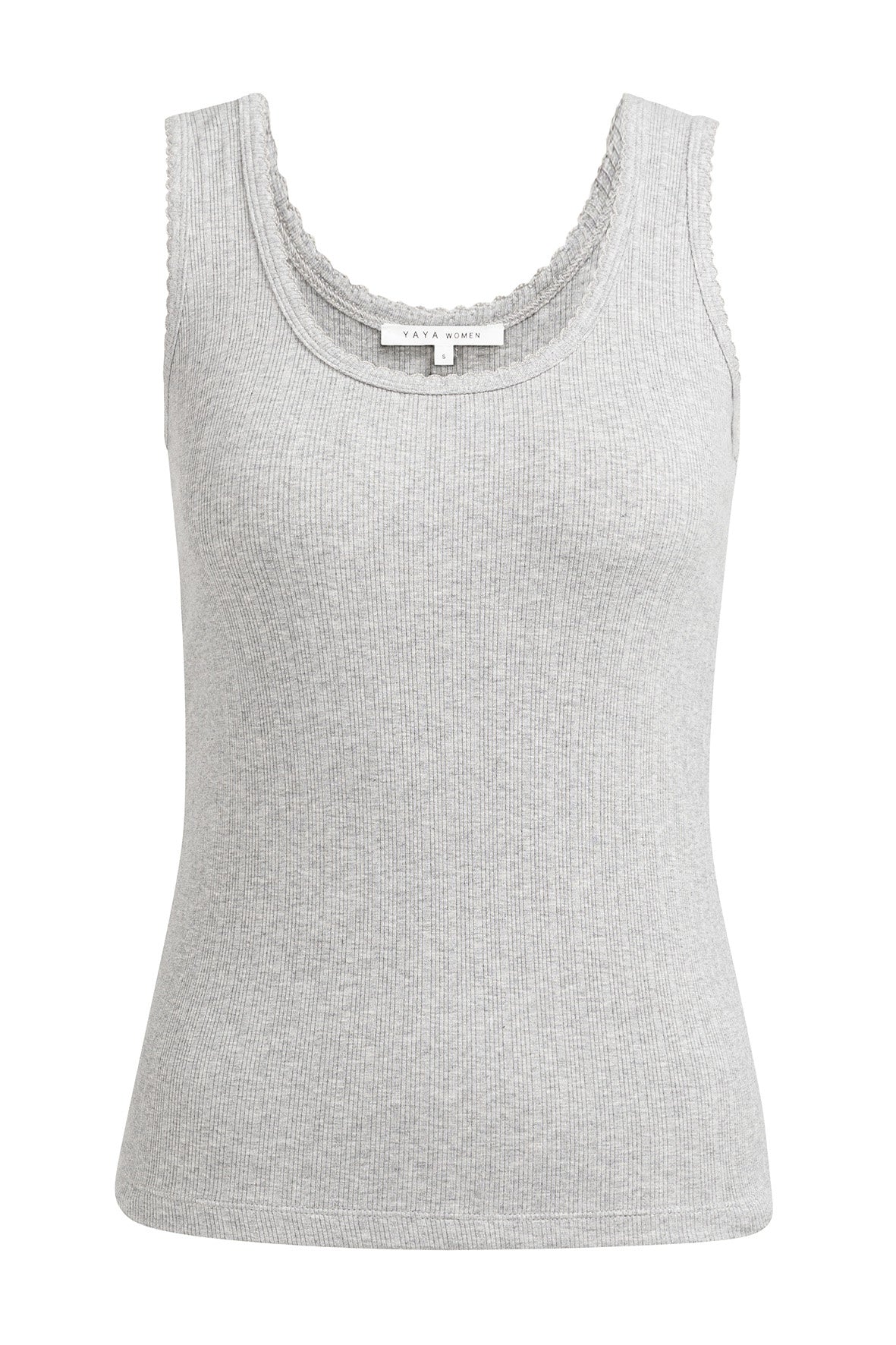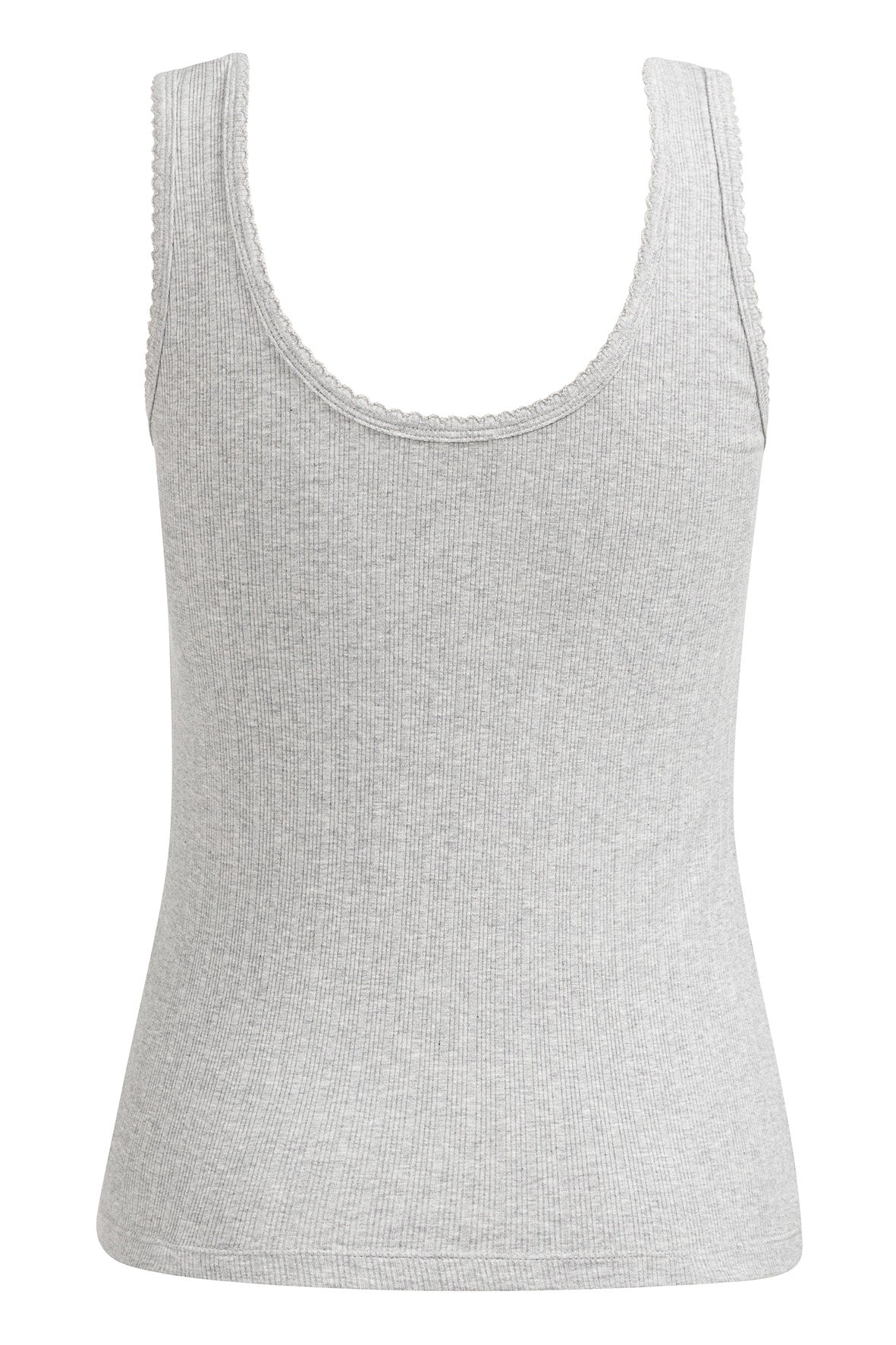 Dit singlet is gemaakt van een zachte, rekbare ribstof en heeft een aangesloten pasvorm. De halslijn en armsgaten zijn verfijnd afgewerkt met een sierlijk golvend randje, wat zorgt voor een vrouwelijke en elegante uitstraling. Perfect om solo te dragen op warme dagen of als basis onder een blouse of vest.