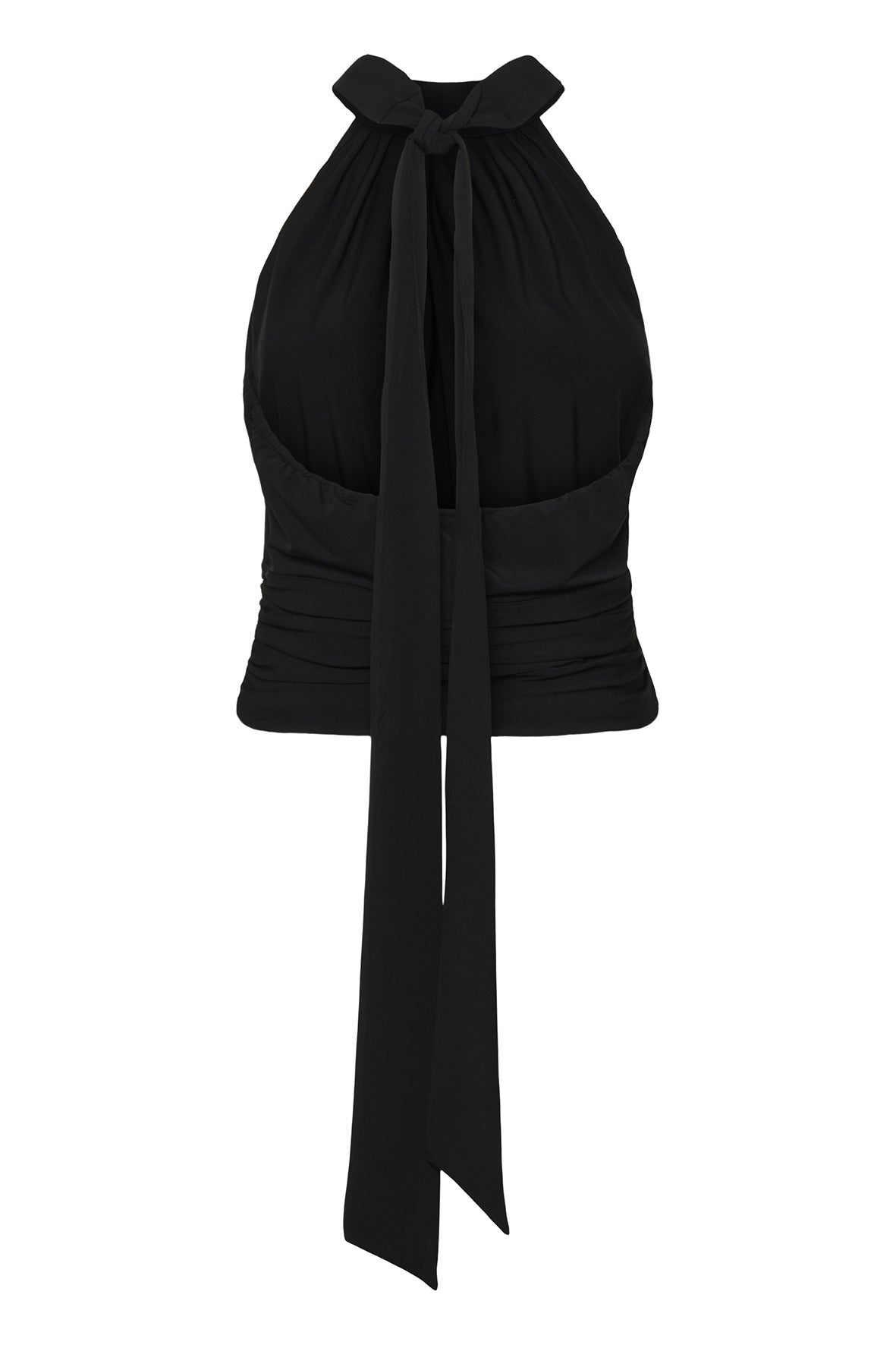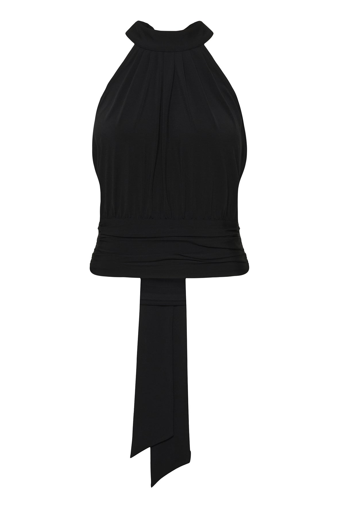 Halterneck top met geplooide hoge hals, mouwloos ontwerp en brede wikkelband met lange, sierlijke strik. Zachtere, soepele uitstraling