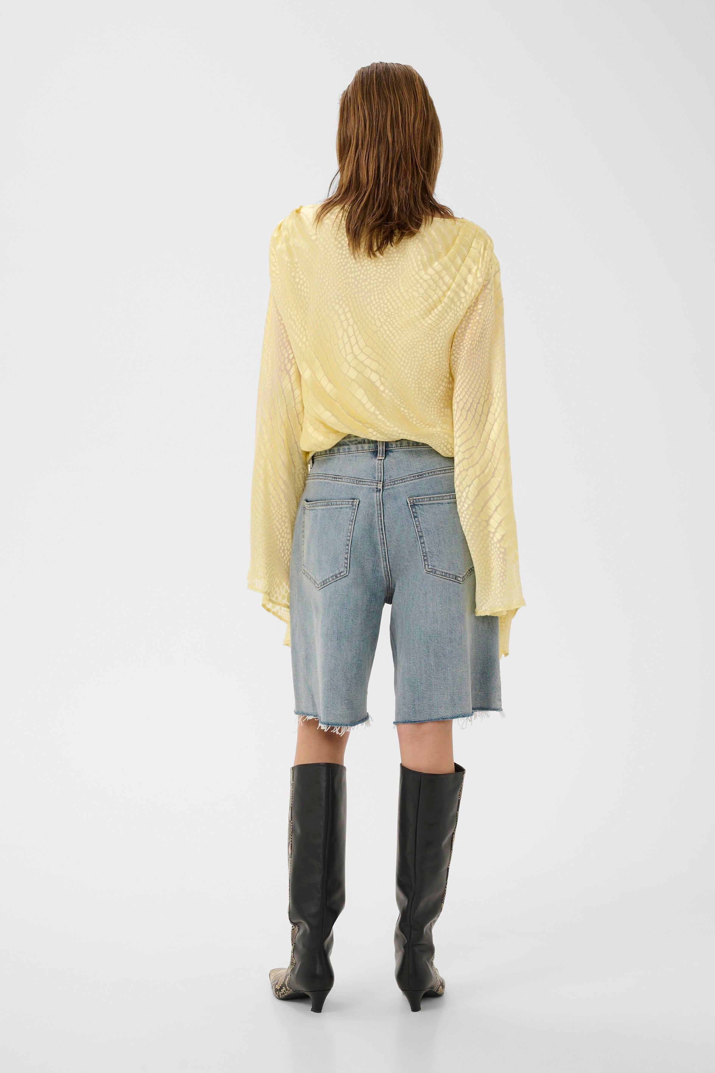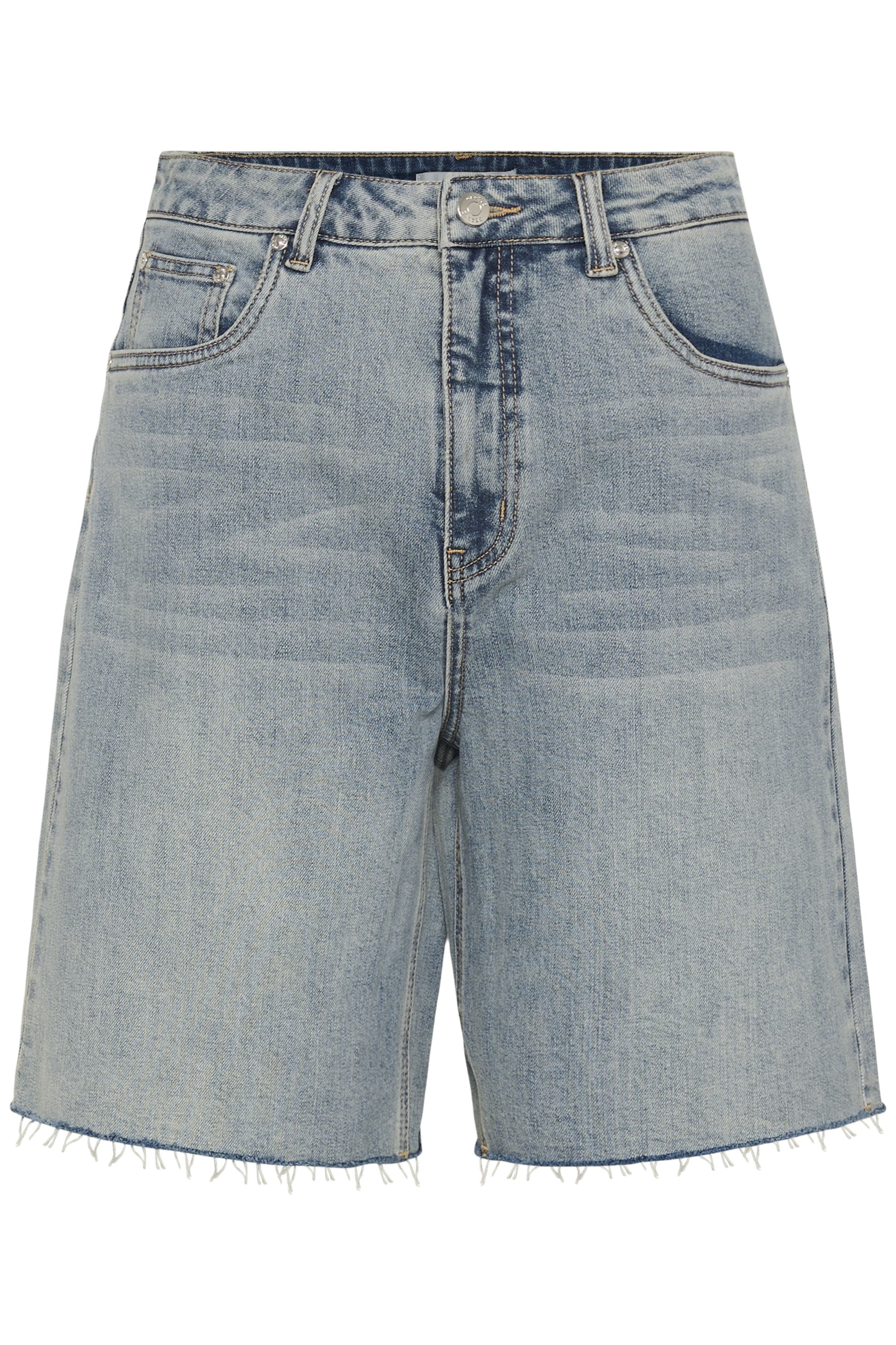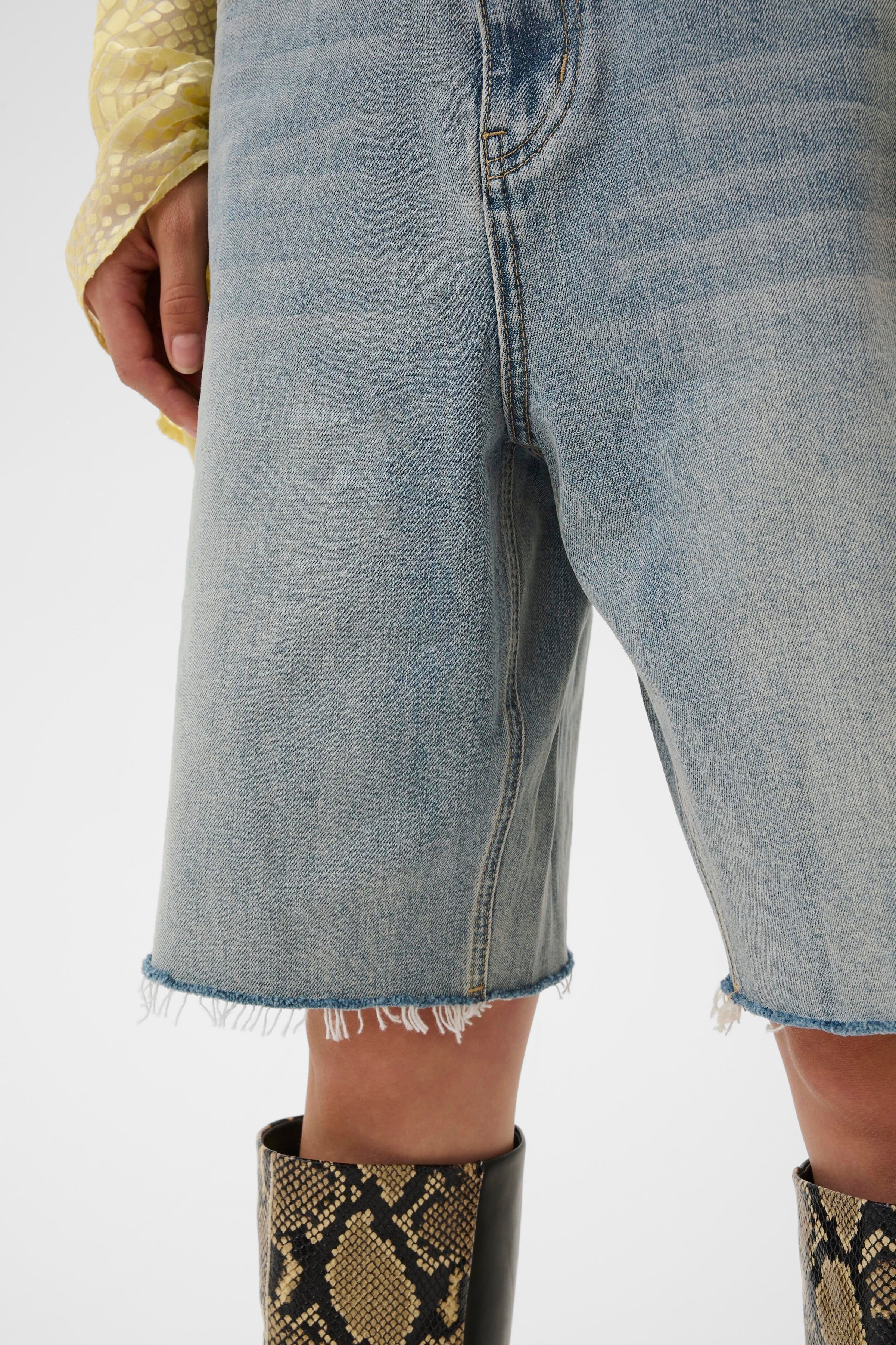 Denim short met rechte pasvorm, onafgewerkte zoom en klassiek vijfzakmodel. Riemlussen en ritssluiting geven een moderne edge.