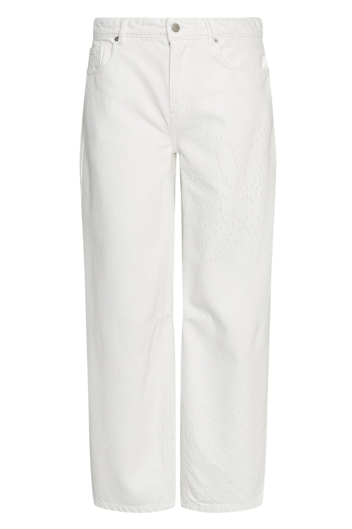 Witte denim broek van stevig katoen. Ontworpen met een klassieke five-pocket constructie, riemlussen en knoop- en ritssluiting. Rechte pijpen met een relaxed silhouet. Tonale borduurdetails op de pijpen.