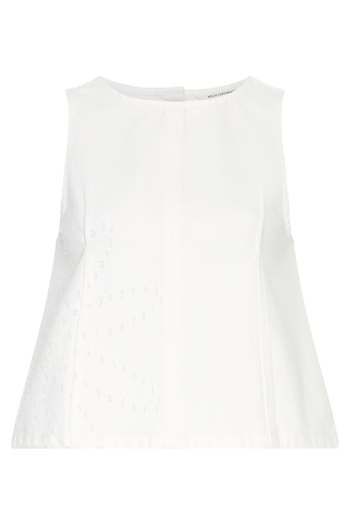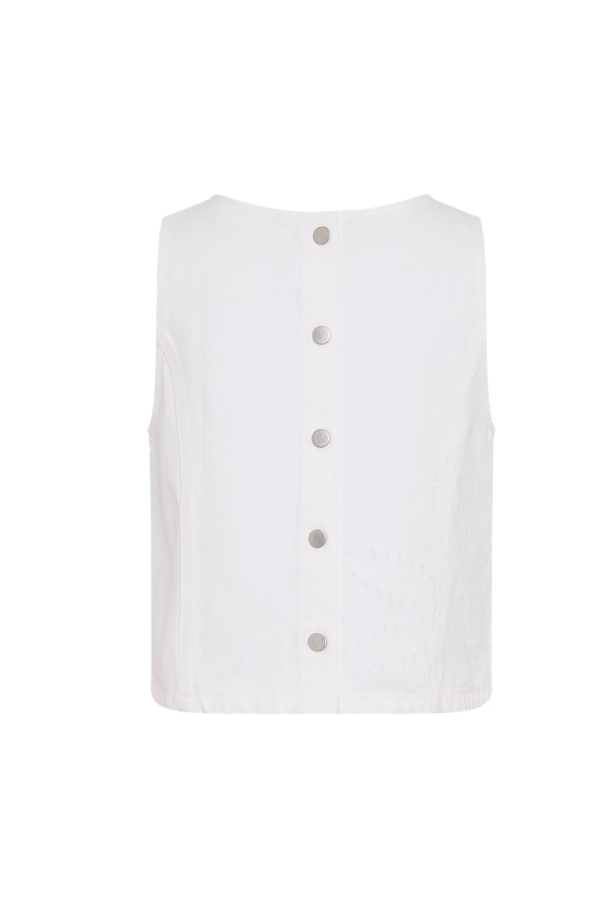 Witte denim top van stevige katoenkwaliteit. Mouwloos model met ronde hals en een rechte pasvorm. Afgewerkt met drukknoopsluiting aan de achterkant. Ton-sur-ton borduurdetails aan de voor- en zijkant.