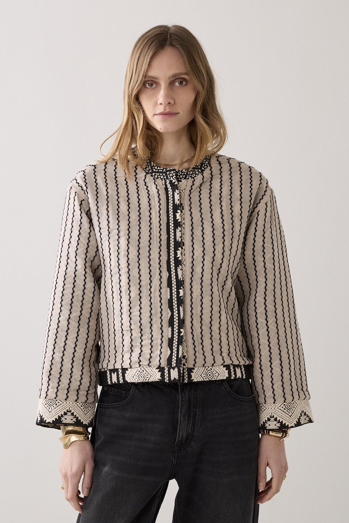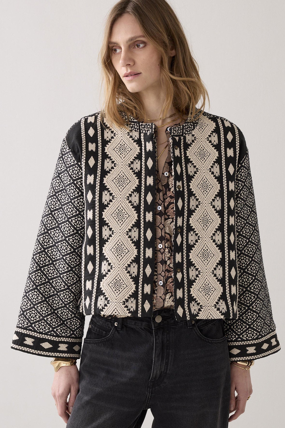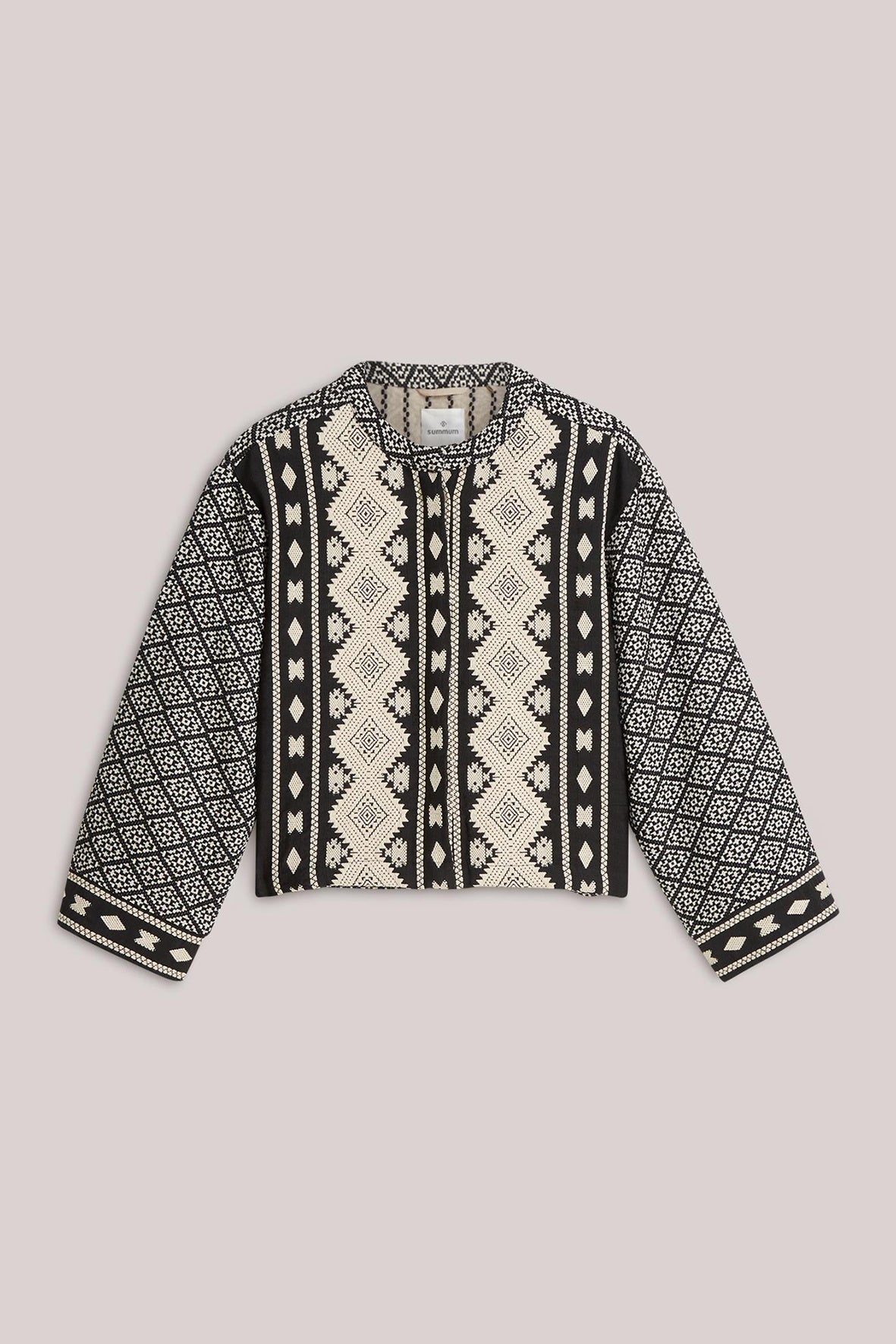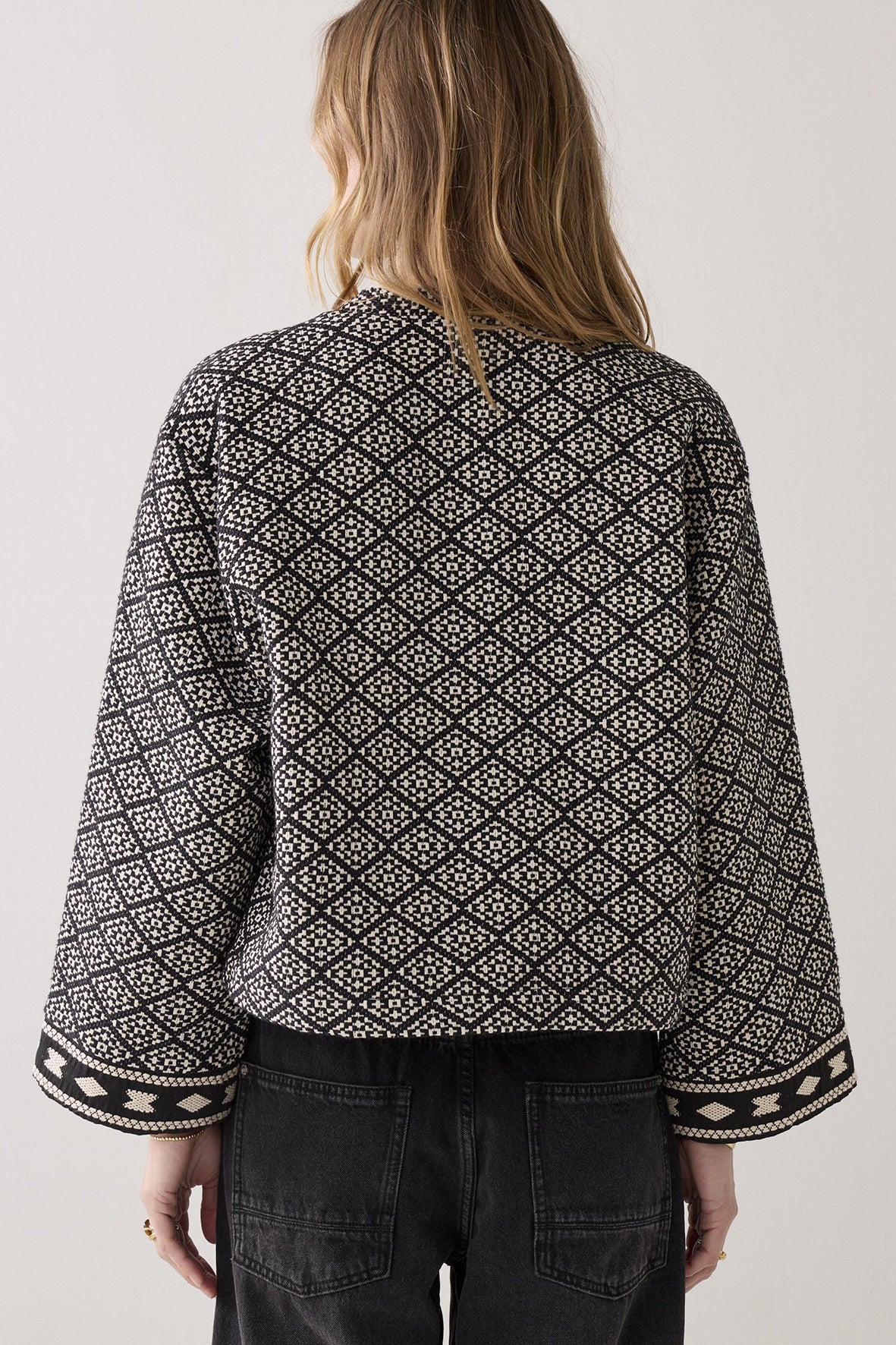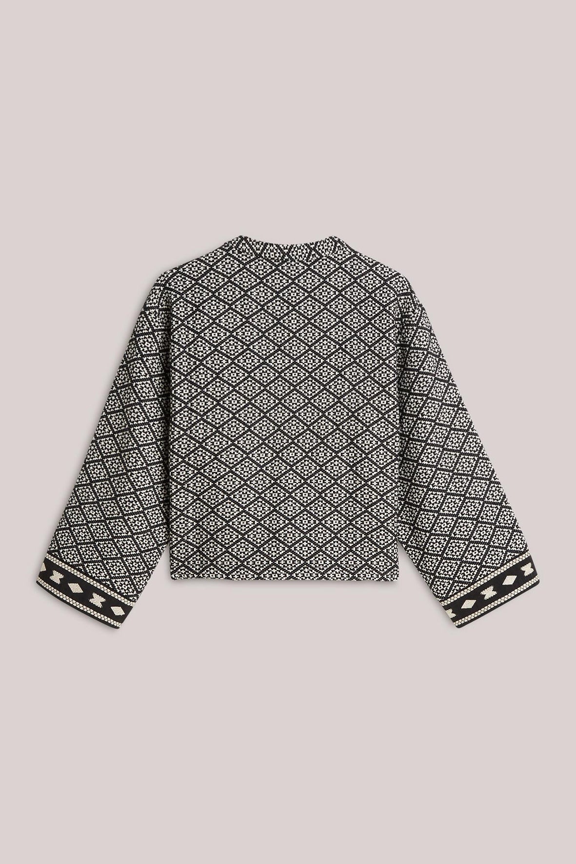 Reversible kimonojasje in een stevige jacquard mix met een rijke, geweven structuur. Het jasje heeft een transparante voering aan de binnenkant.