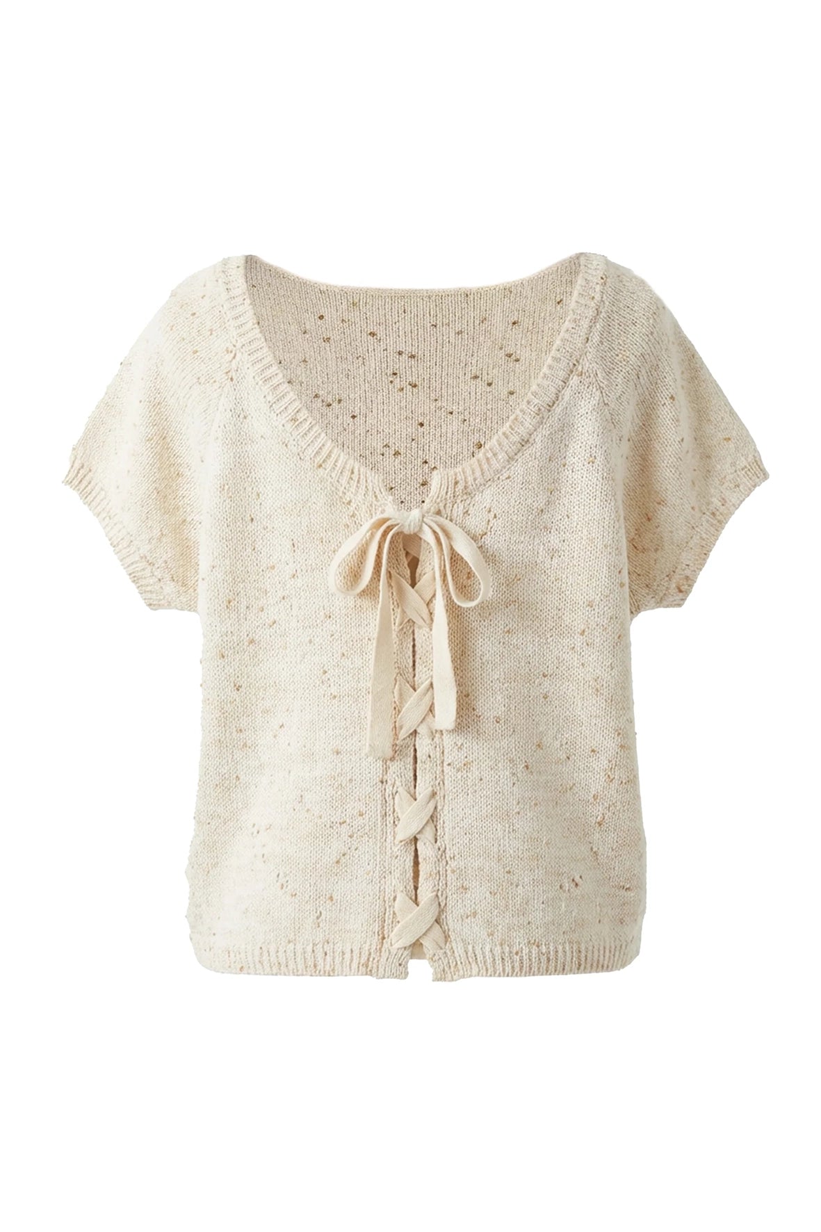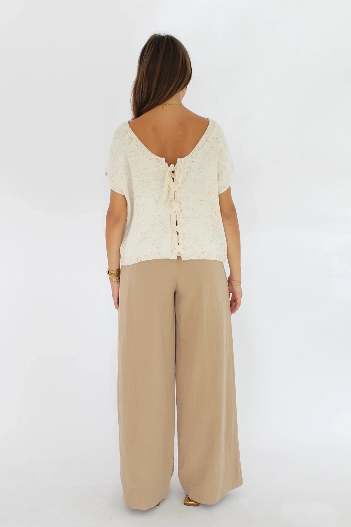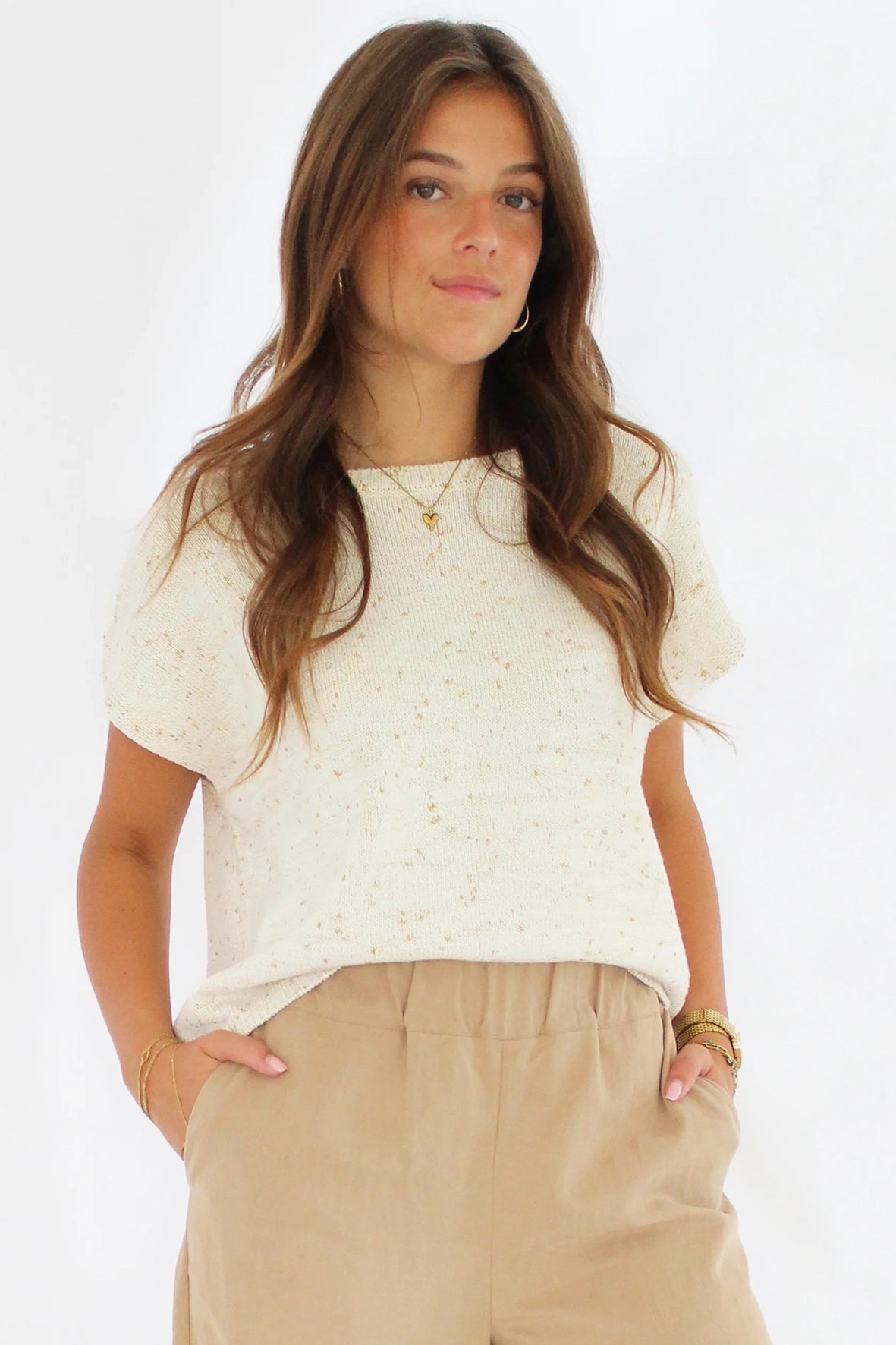 Een van de favoriete breisels van dit seizoen is de Gigas top. De top heeft een losvallend model met een gestrikt detail op de achterzijde en is voorzien van een subtiele gouden sparkle.