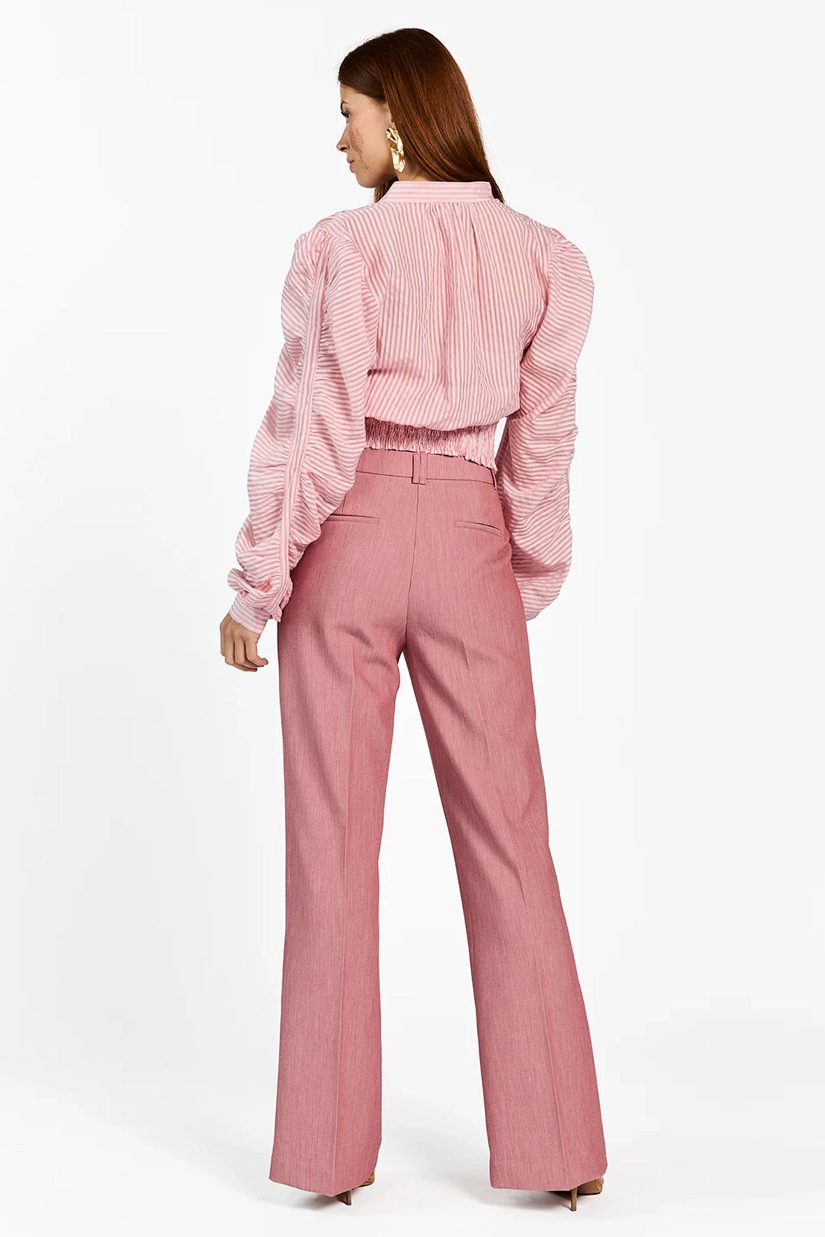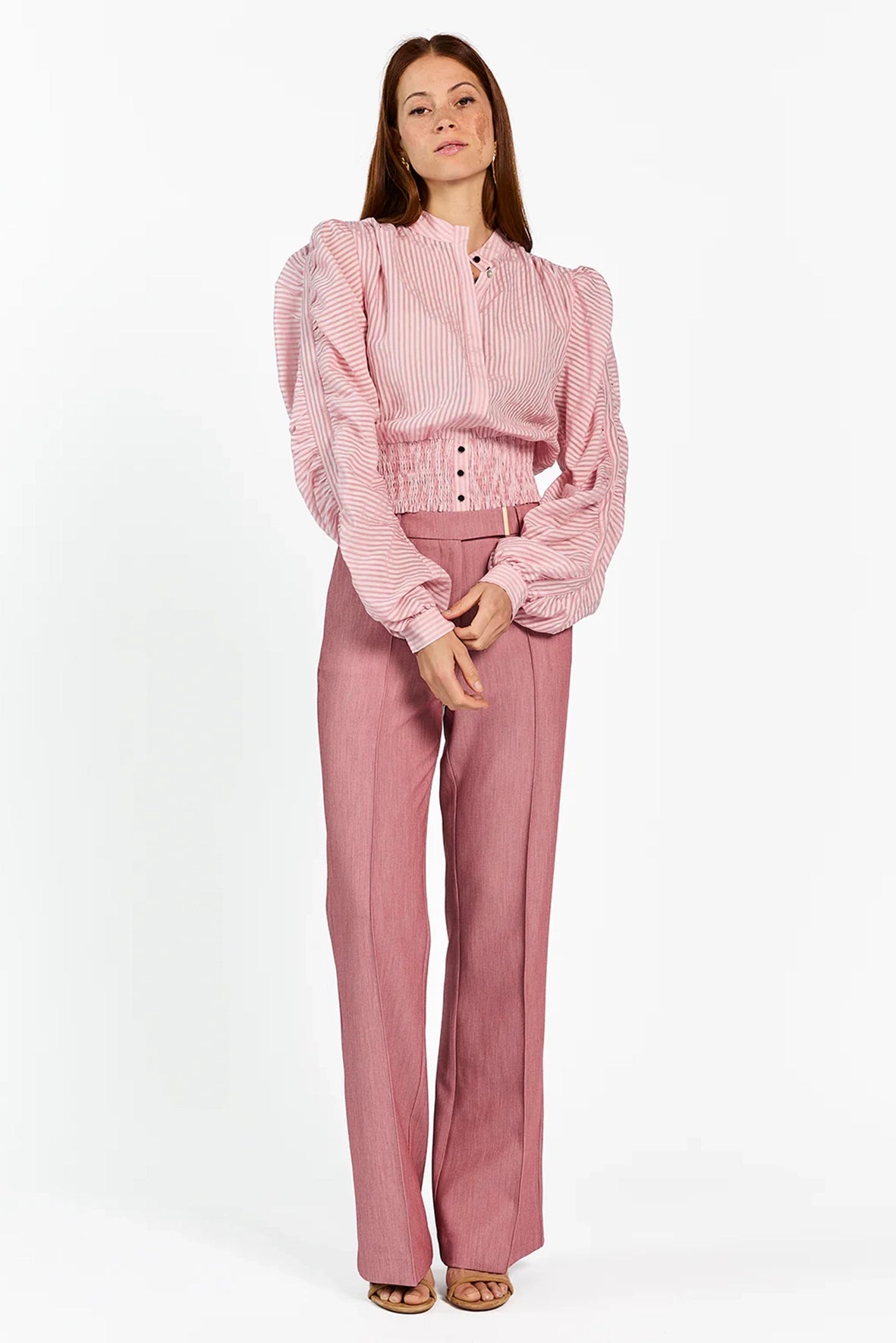 De Beaudine Blouse heeft een vrouwelijke uitstraling met een modern randje. De streepstructuur en volumineuze mouwen geven het silhouet karakter, terwijl de gesmokte taille zorgt voor een flatterende pasvorm. Het lichte materiaal draagt comfortabel en beweegt soepel met je mee. Combineer met de Chantalle Broek voor een gestroomlijnde look die zowel geschikt is voor werk als diner.