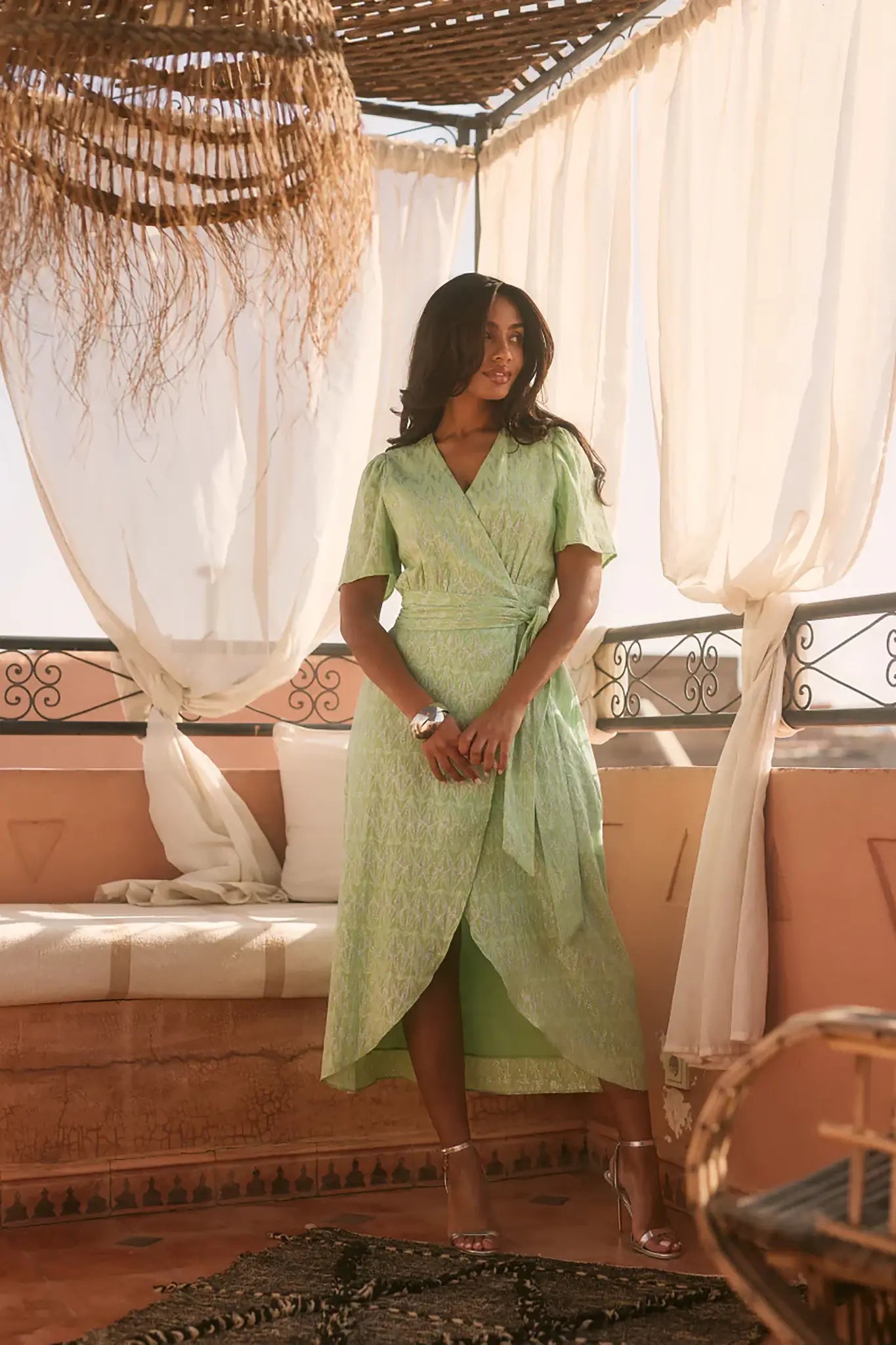Deze elegante overslagjurk is gemaakt van een luxe katoen jacquard stof met glanzend lurex garen, wat zorgt voor een verfijnde en stijlvolle uitstraling. De tailleband accentueert het silhouet, terwijl de korte mouwen een speelse touch toevoegen. Perfect voor zowel casual als feestelijke gelegenheden.