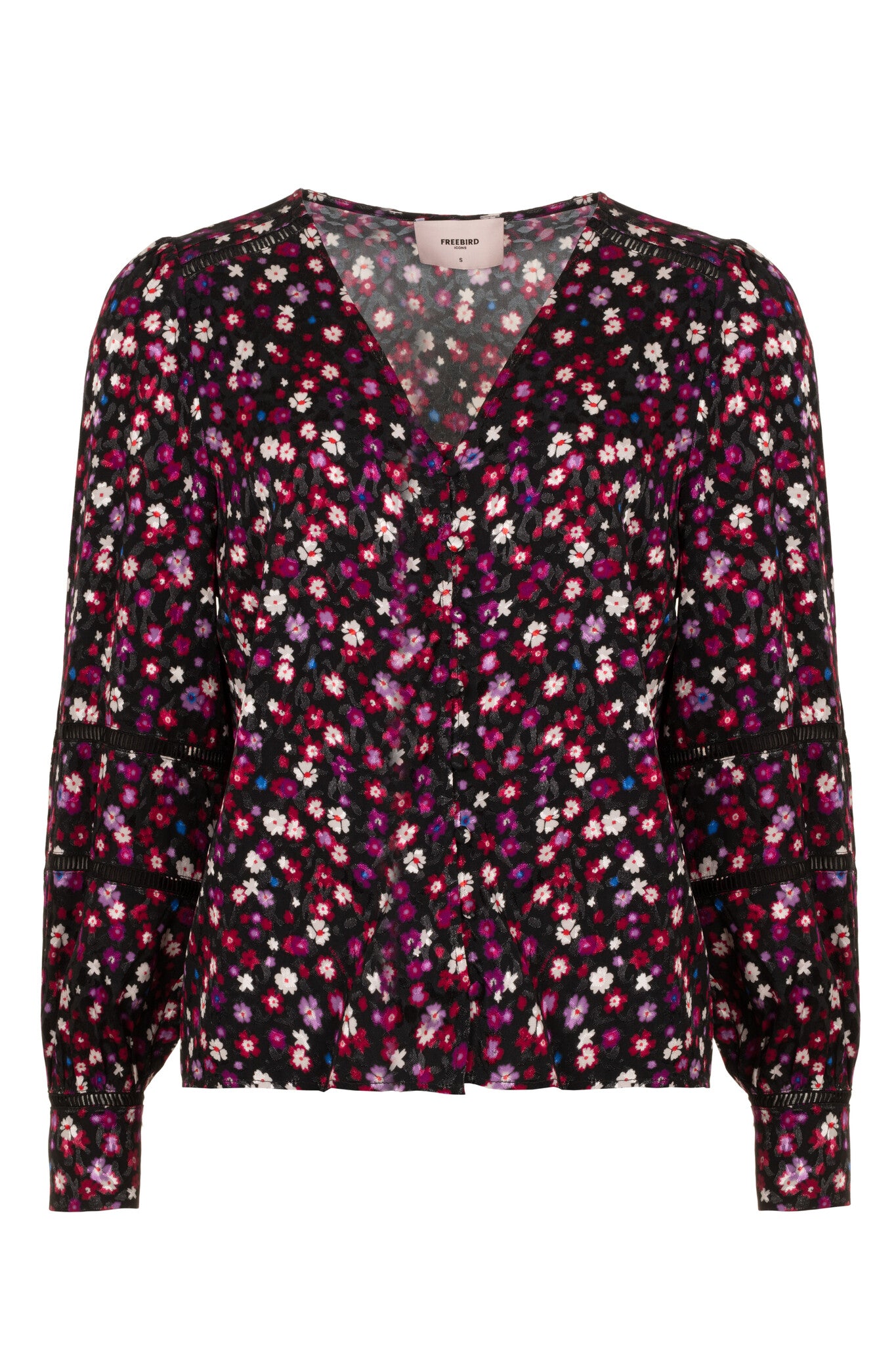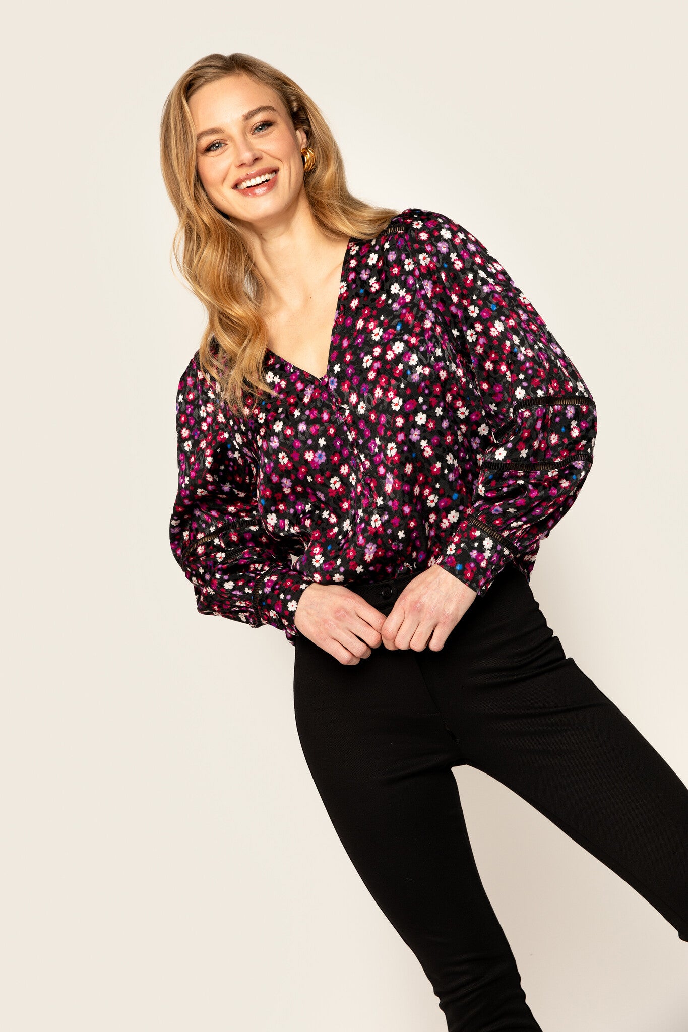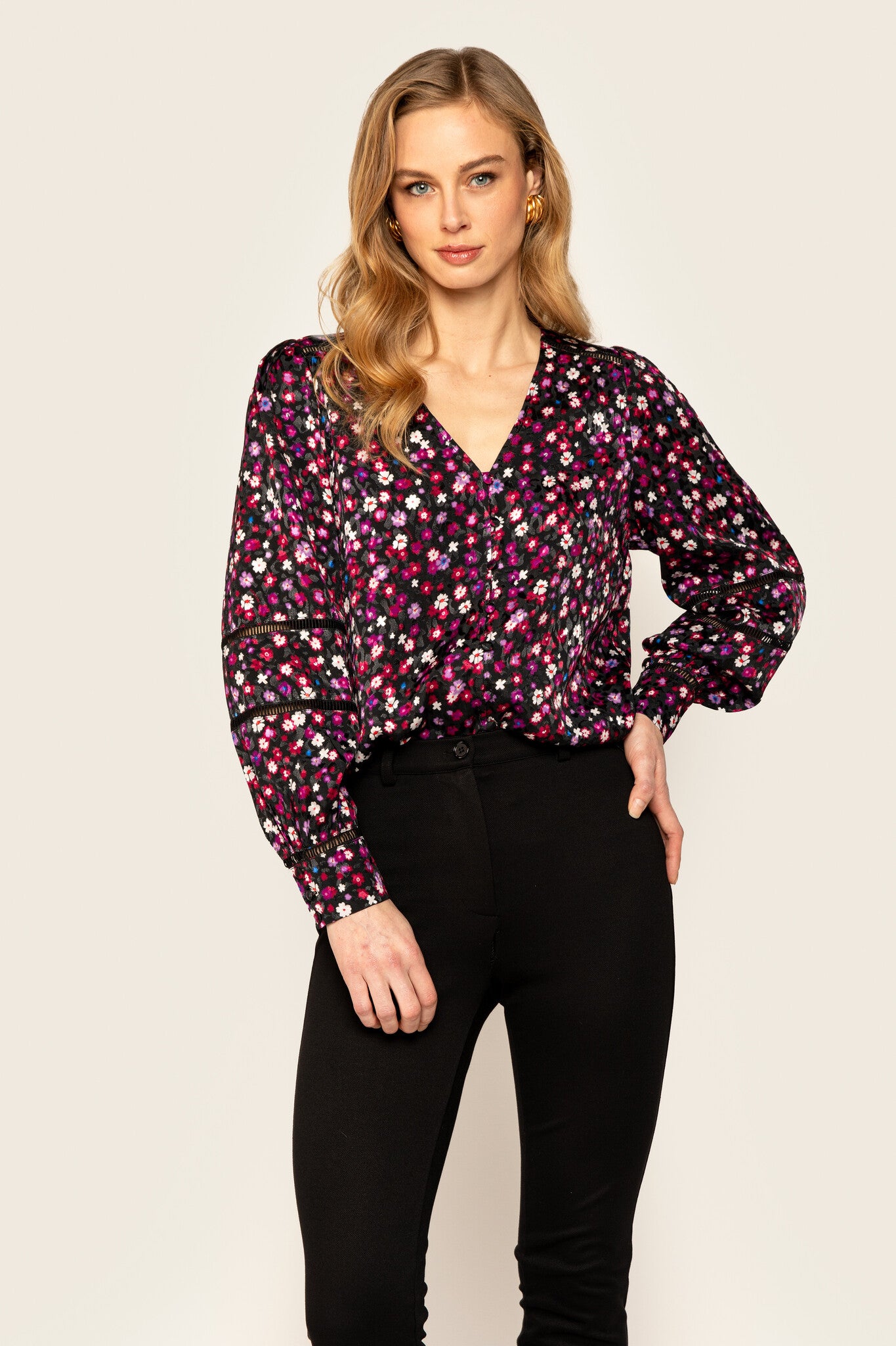 Prachtige blouse met bloemenprint, lange mouwen, V-hals, self-fabric knopen en ballonmouwen.