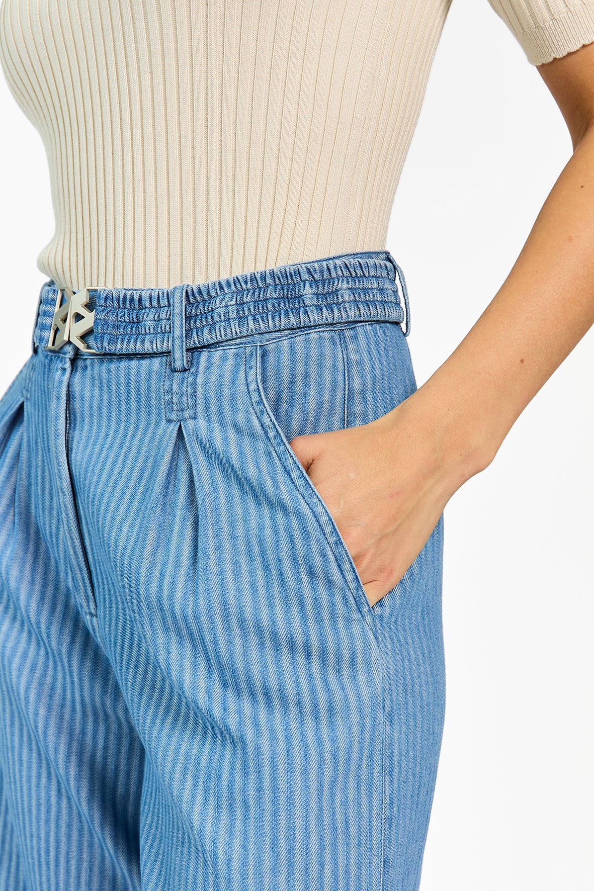 Deze broek is uitgevoerd in een soepele denimstof met een verfijnd streeppatroon. Het model heeft een hoge taille met plooidetails aan de voorzijde en wijde, rechte pijpen voor een elegante pasvorm. De elastische tailleband zorgt voor extra comfort. Goed te combineren met de blouse Serene voor een complete en stijlvolle look.