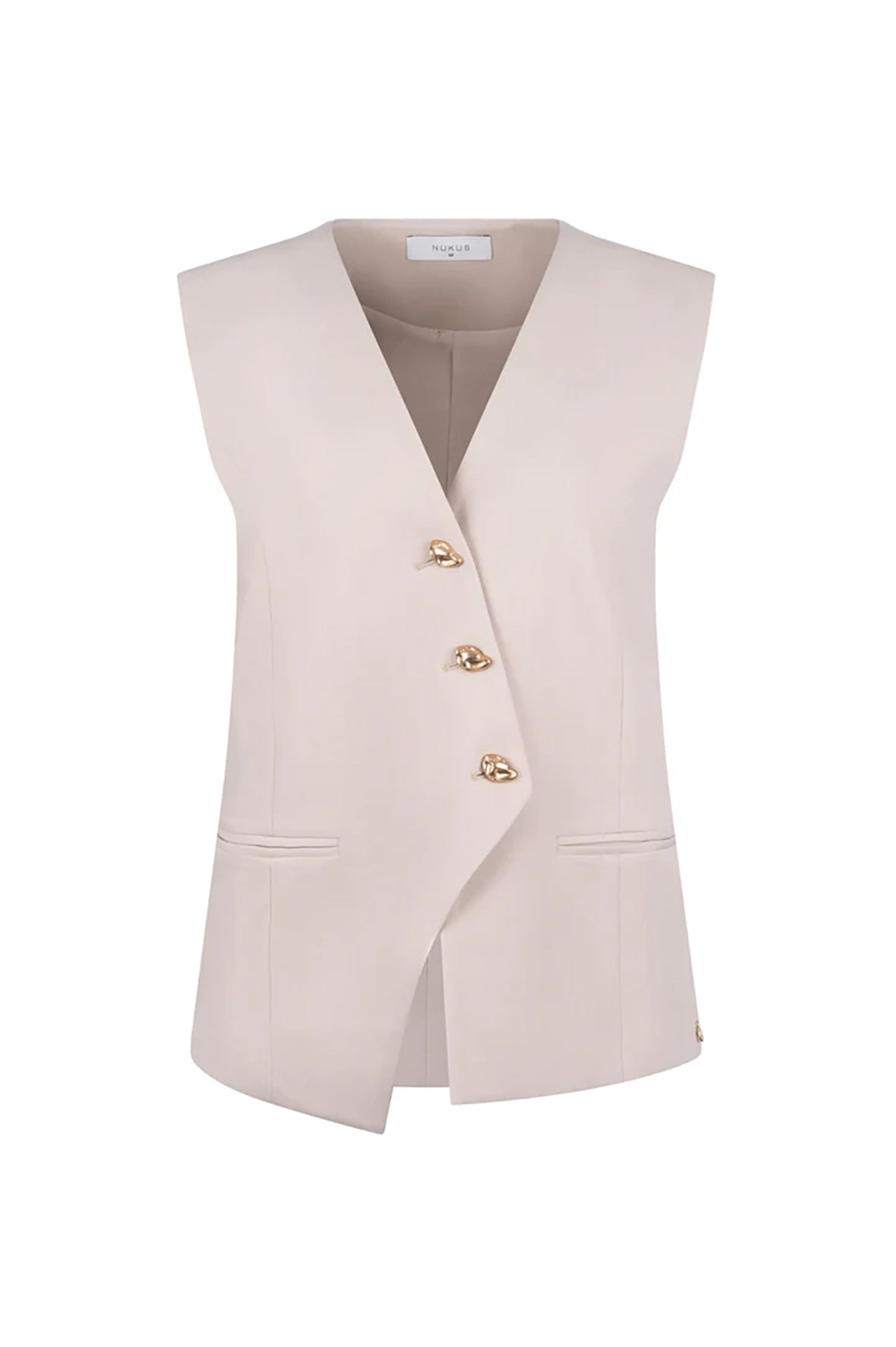 Het Julia Gilet is mooi getailleerd en voorzien van een schuine knoopsluiting voor een eigentijdse touch. De paspelzakjes aan de voorkant maken het geheel compleet. Perfect te combineren met de Jill Pants voor een stijlvolle set.