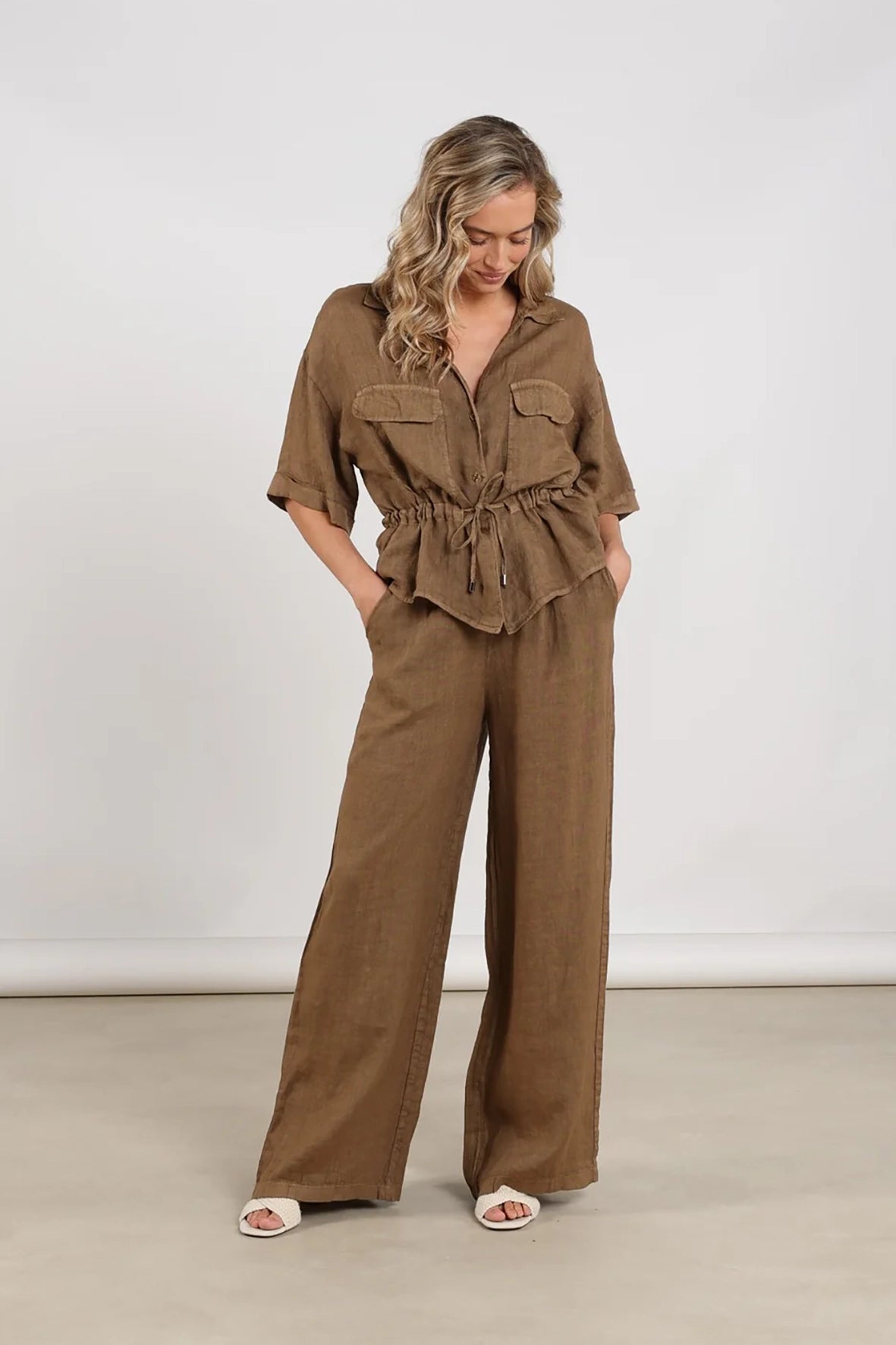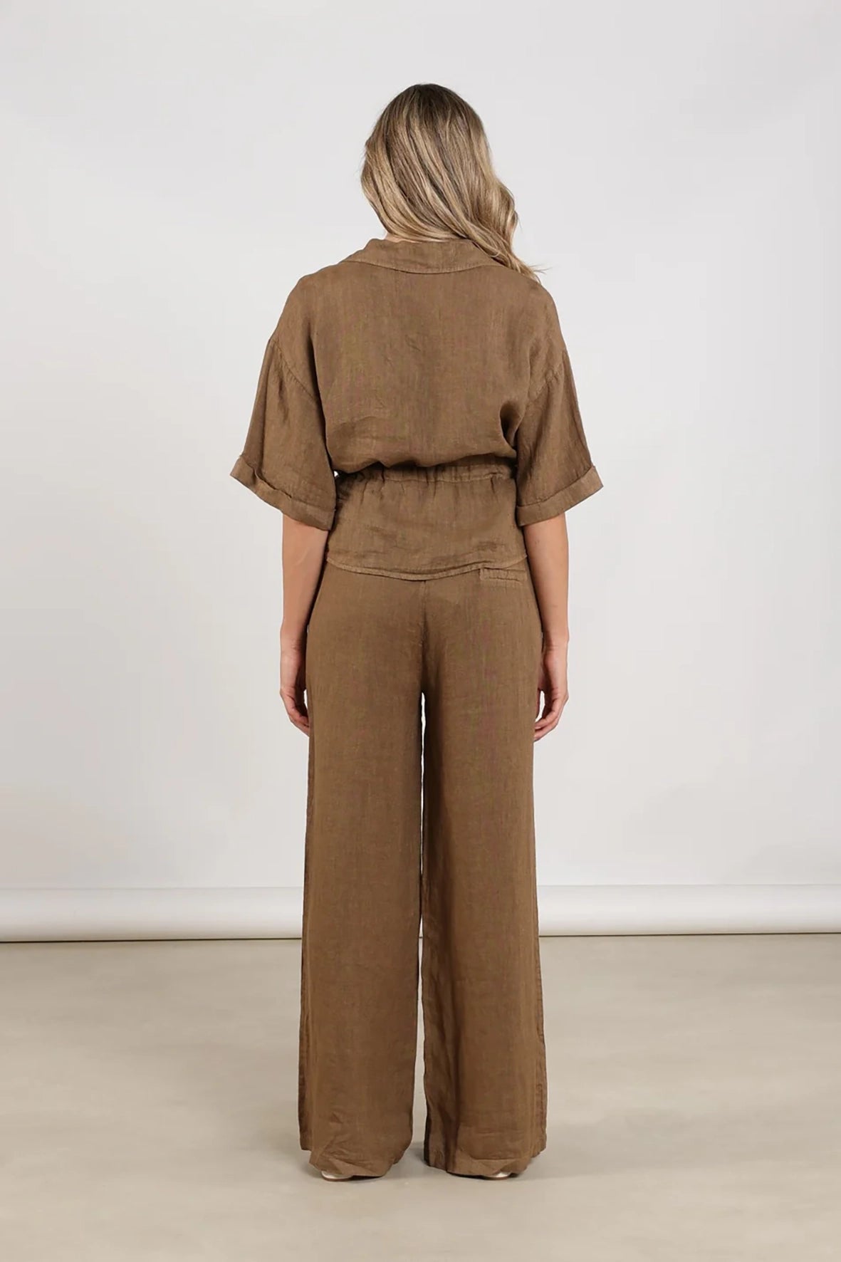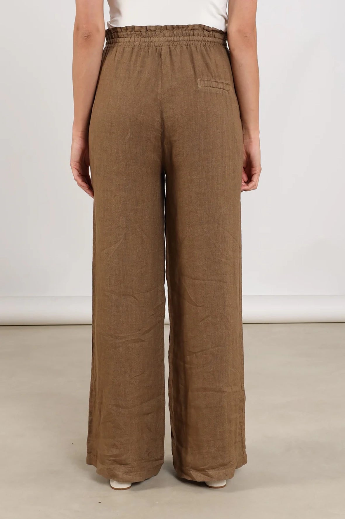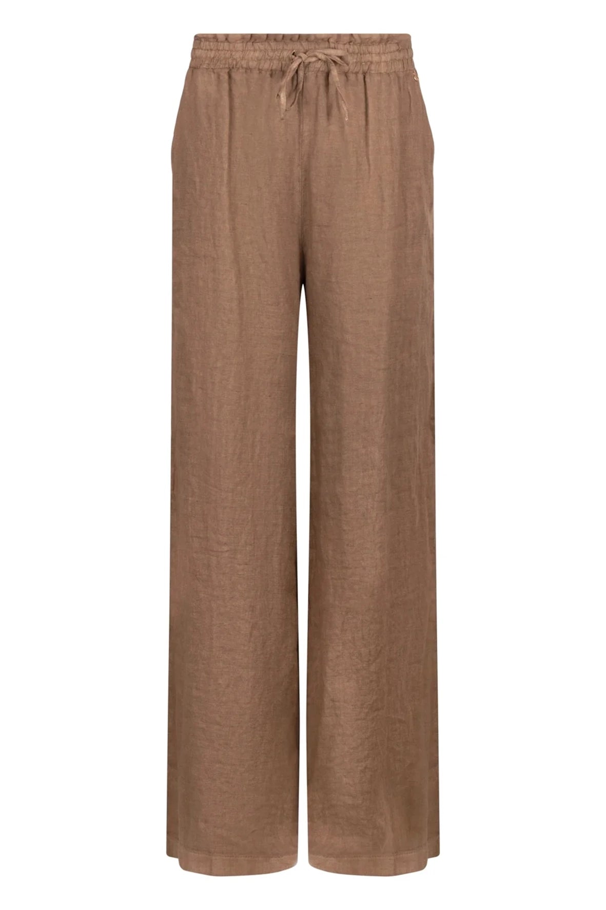 Deze linnen broek is gemaakt van 100% linnen en heeft een aangerimpelde tailleband met koordje voor een comfortabele pasvorm. Perfect te combineren met de Elma blouse voor een luchtige en stijlvolle outfit.