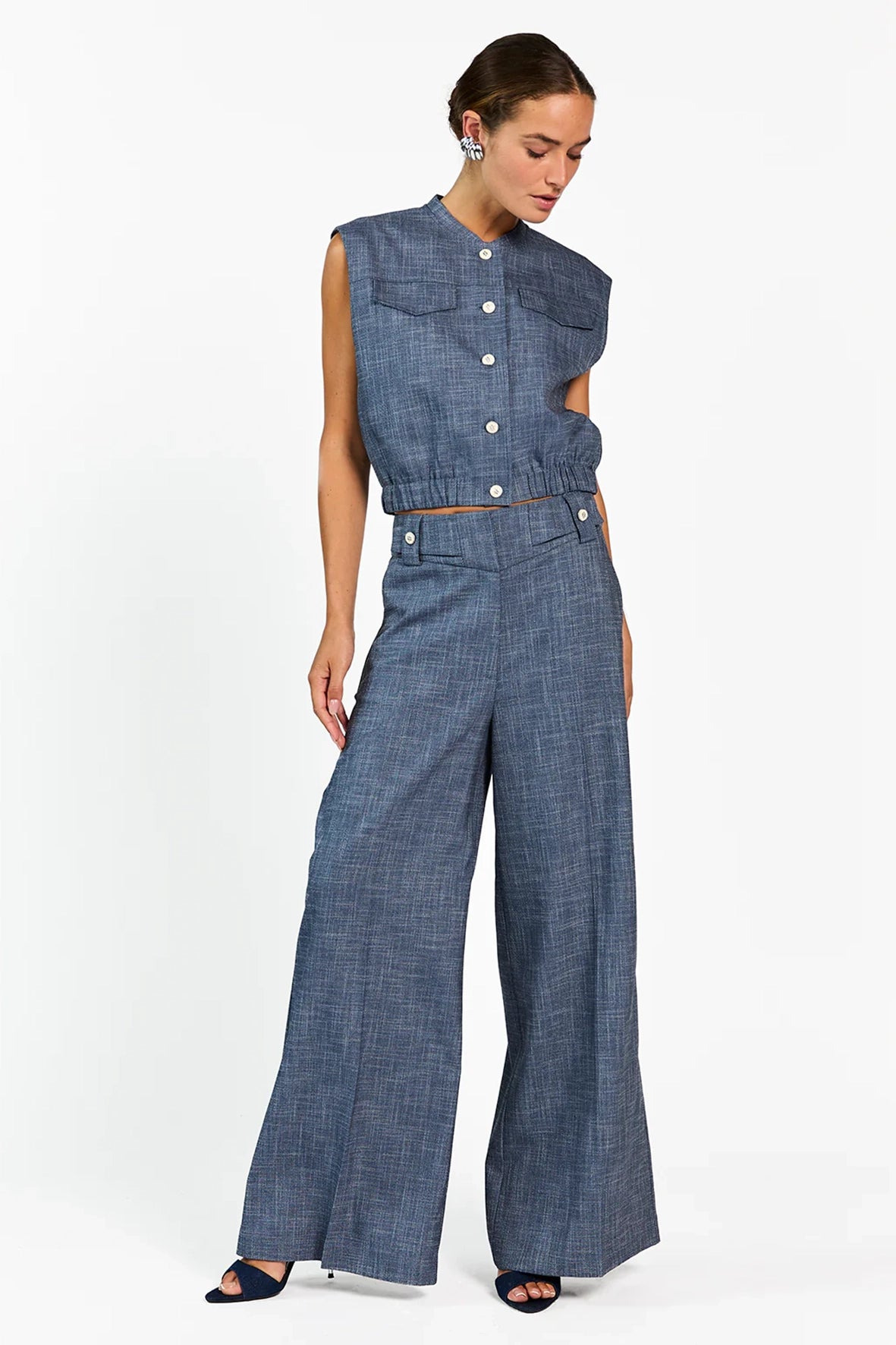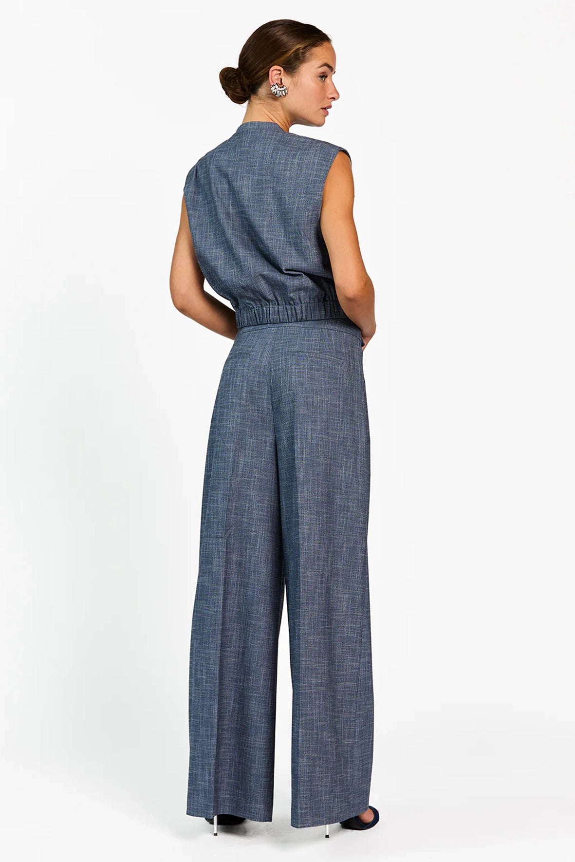 De Nore Broek heeft een rechte, wide leg fit en is gemaakt van een soepelvallende stof met subtiele structuur. De knoopdetails en de geplooide tailleband geven het design net wat extra’s. Draag met het Lauryn Jack voor een co-ord set of combineer met het Olivia Gilet voor een iets lichtere look.