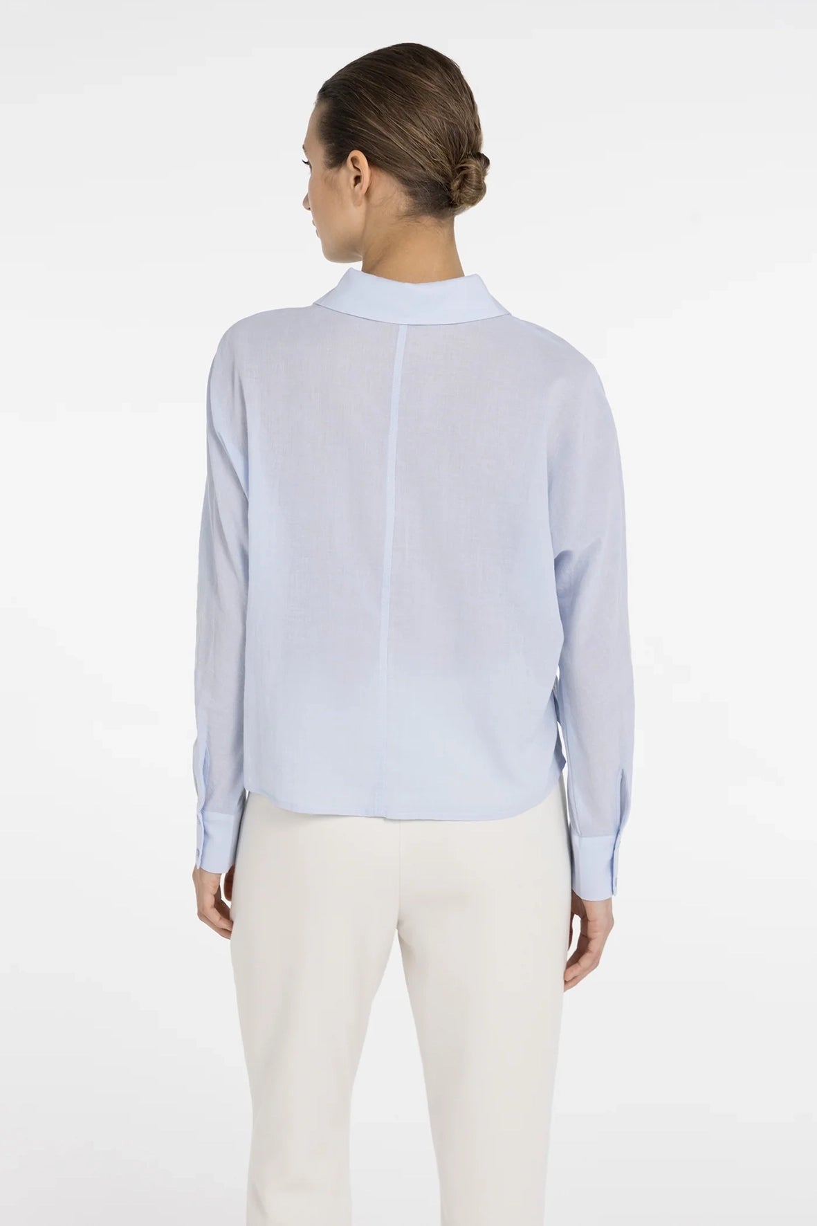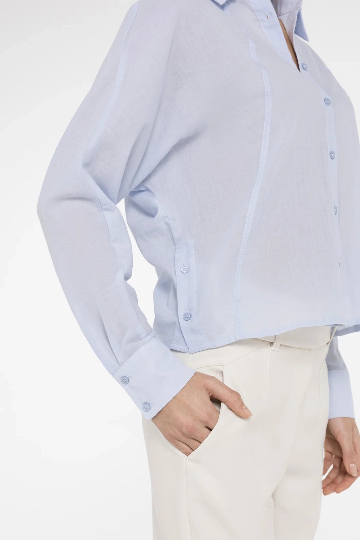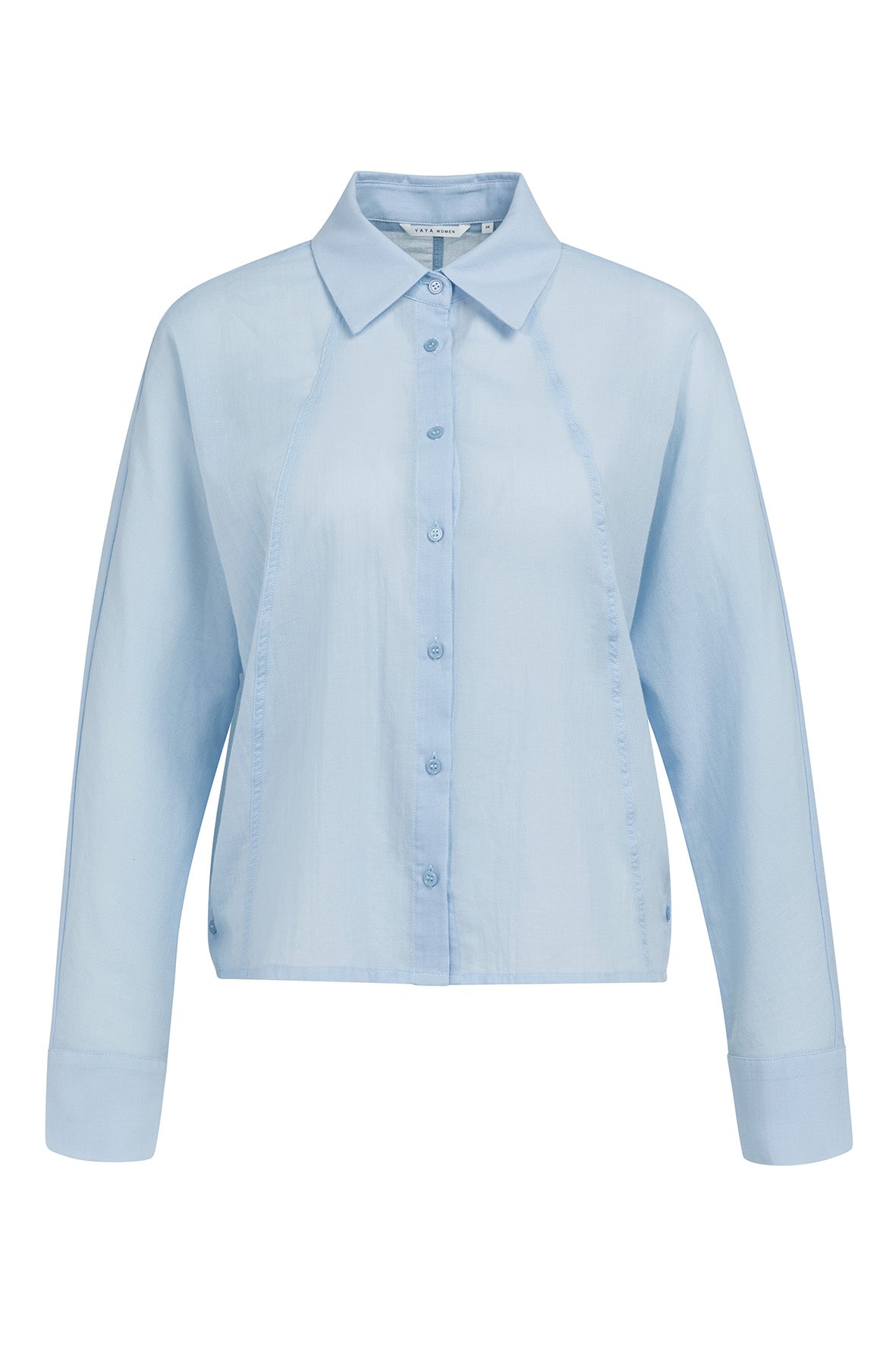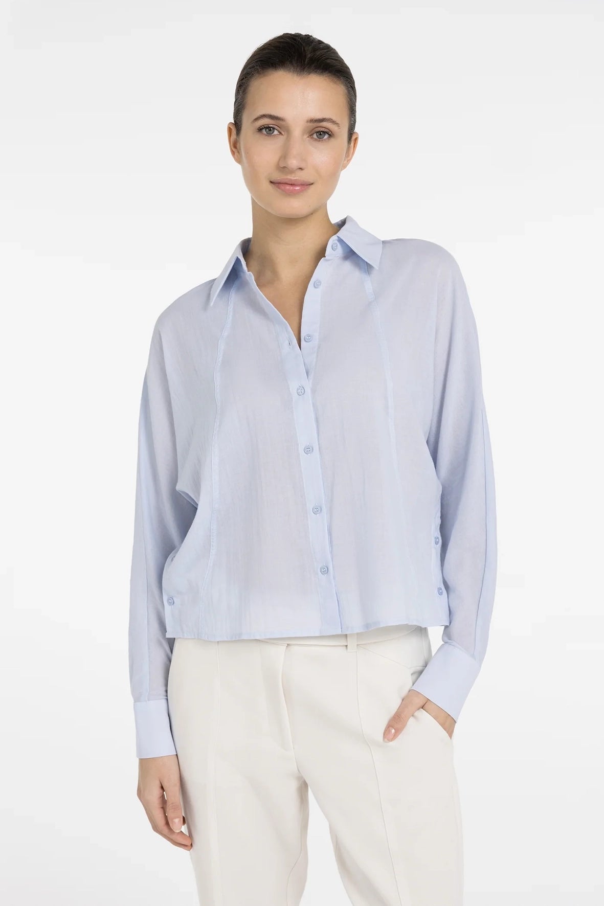 Deze luchtige batwing blouse is gemaakt van een lichtgewicht, geweven katoenmix. Het model heeft een losse pasvorm, een klassieke kraag, knoopsluiting aan de voorkant en lange vleermuismouwen die uitlopen in brede manchetten. De opvallende schuine naden geven de blouse een moderne look. De knoopdetails aan de zijkant zorgen voor een subtiel en speels accent. Een verfijnde keuze voor een elegante dagelijkse stijl.